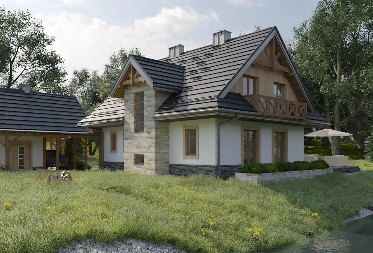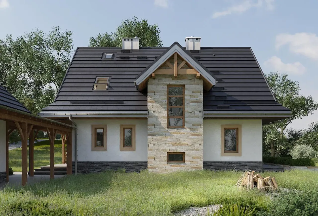 Technologia i konstrukcja: murowana – ceramika.; Ściany zewnętrzne: bloczki ceramiczne Porotherm gr. 25 cm, ocieplone płytami styropianowymi GOLD FASADA firmy Termoorganika o gr. 15 cm.; Ściany wewnętrzne: konstrukcyjne: bloczki ceramiczne Porotherm gr. 25 cm, działowe: bloczki ceramiczne Porotherm gr. 11,5 cm.; Strop: żelbetowy.; Konstrukcja dachu: drewniana.; Rodzaj schodów: żelbetowe.; Typ ogrzewania: kocioł na paliwo stałe.; Pokrycie dachu: dachówka ceramiczna firmy CREATON.; Elewacja: tynk mineralny firmy SICHER BAUTECHNIK, fragmenty ścian – obłożone okładziną drewnianą i kamienną. Podmurówka:płytki klinkierowe.Parametry Techniczne gotowego projektu domu Jadzia