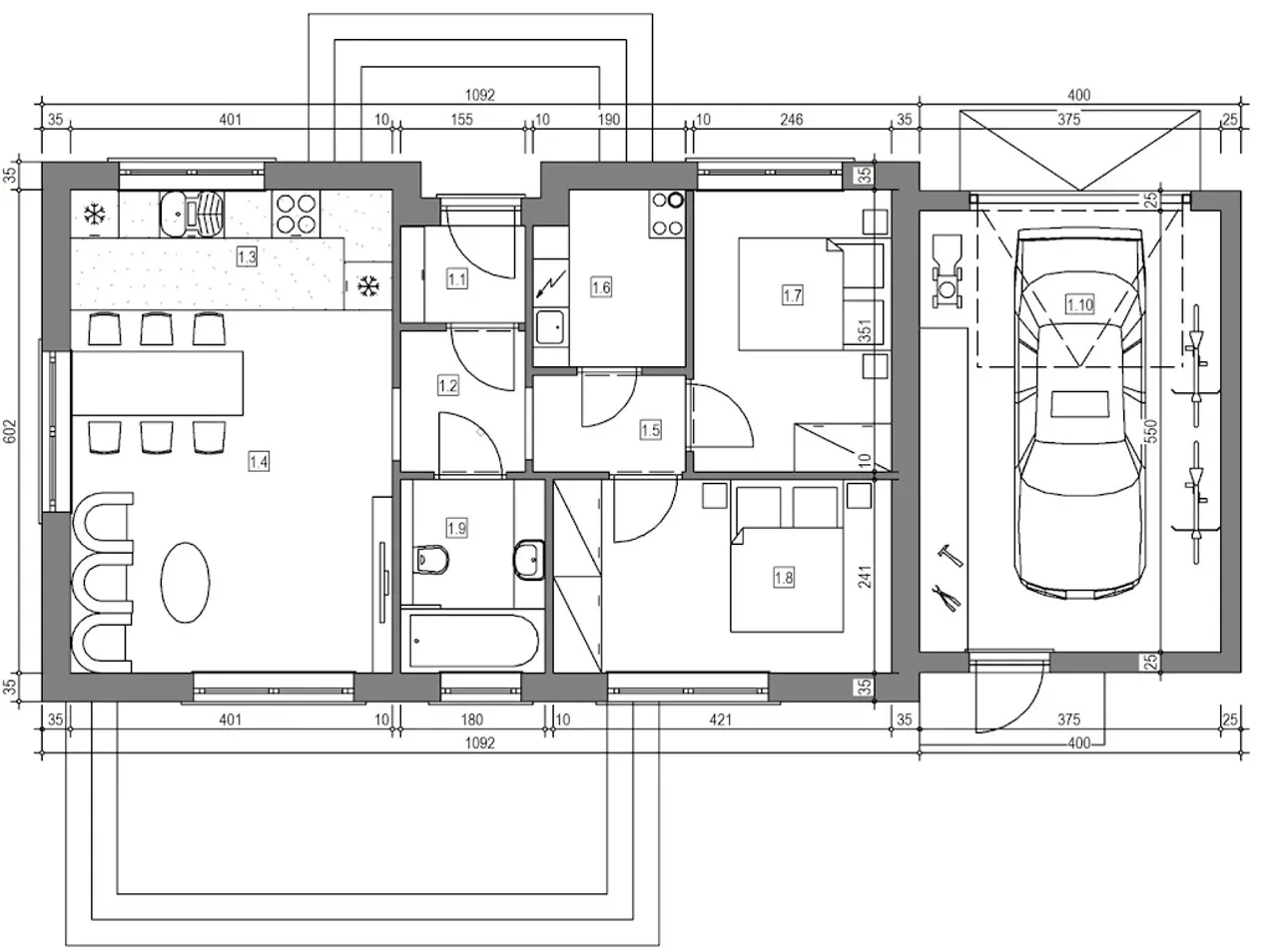 Wypełnij formularz i otrzymaj rysunki w pdf z dokładnymi wymiarami budynku i pomieszczeń (długość, szerokość, wysokość) dla projektu 003 ES+G 57 - Domek Miodowy 57 z garażem