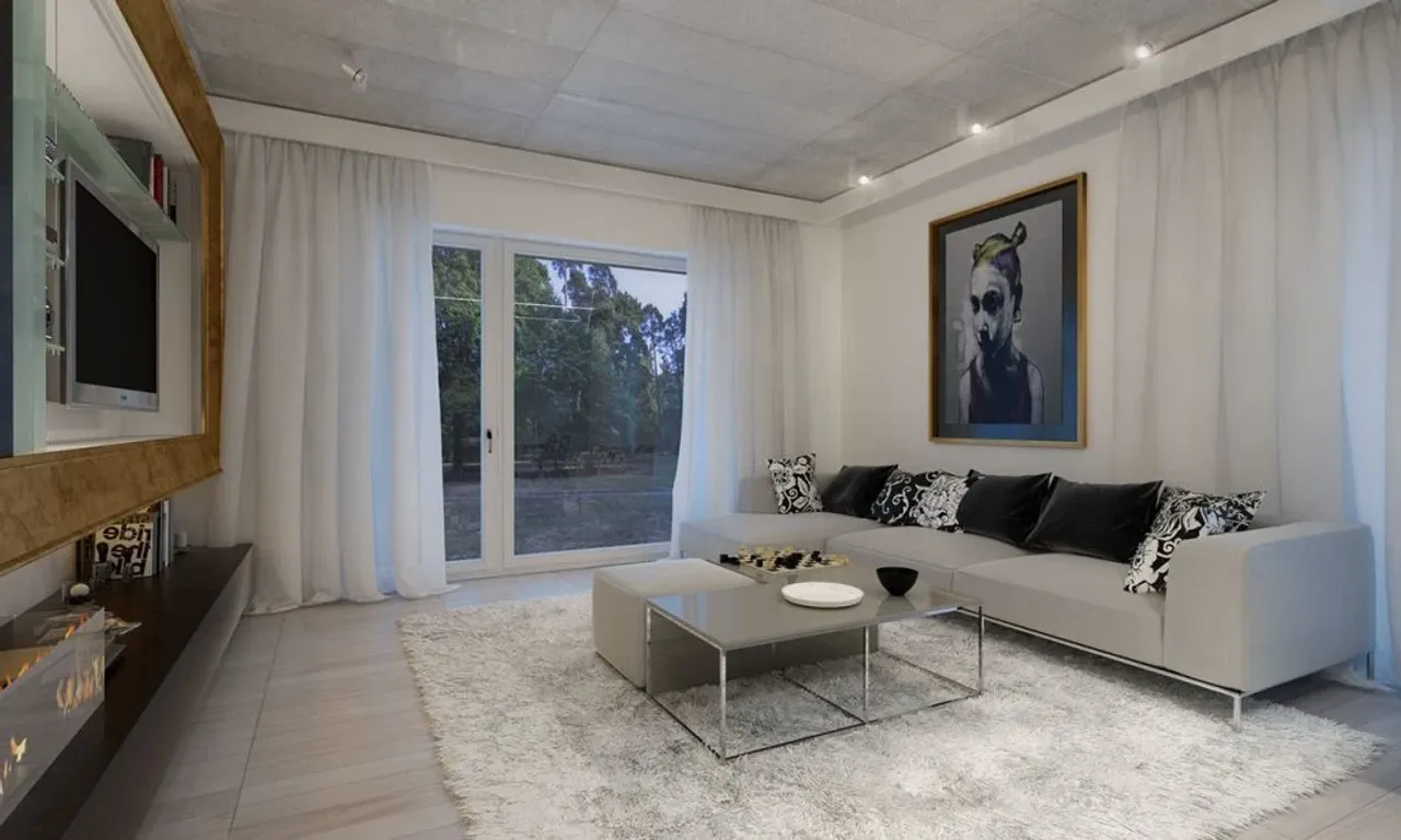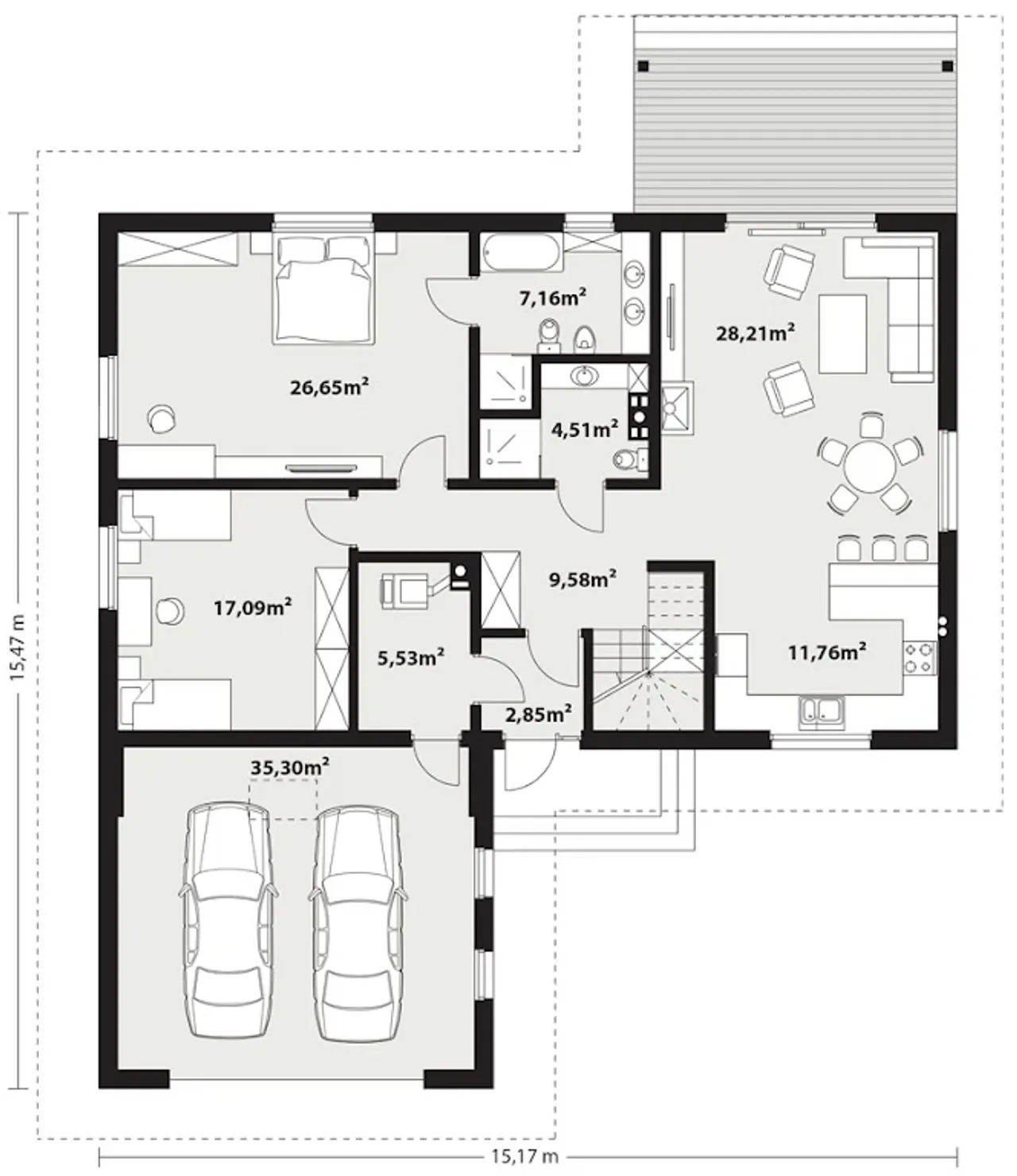 W domu Abra 3 w wersji szkieletowej drewnianej ( mamy też w ofercie Abra 3 - murowana ), autor postawił na przestrzeń i funkcjonalność. Salon ma niemal 30 metrów kwadratowych, co w połączeniu z naprawdę sporą bo niemal 12 metrową kuchnią daje już spójną 40to metrową całość. Gdy otwiera się na duży, zadaszony taras - daje to poczucie dużo większej przestrzeni.