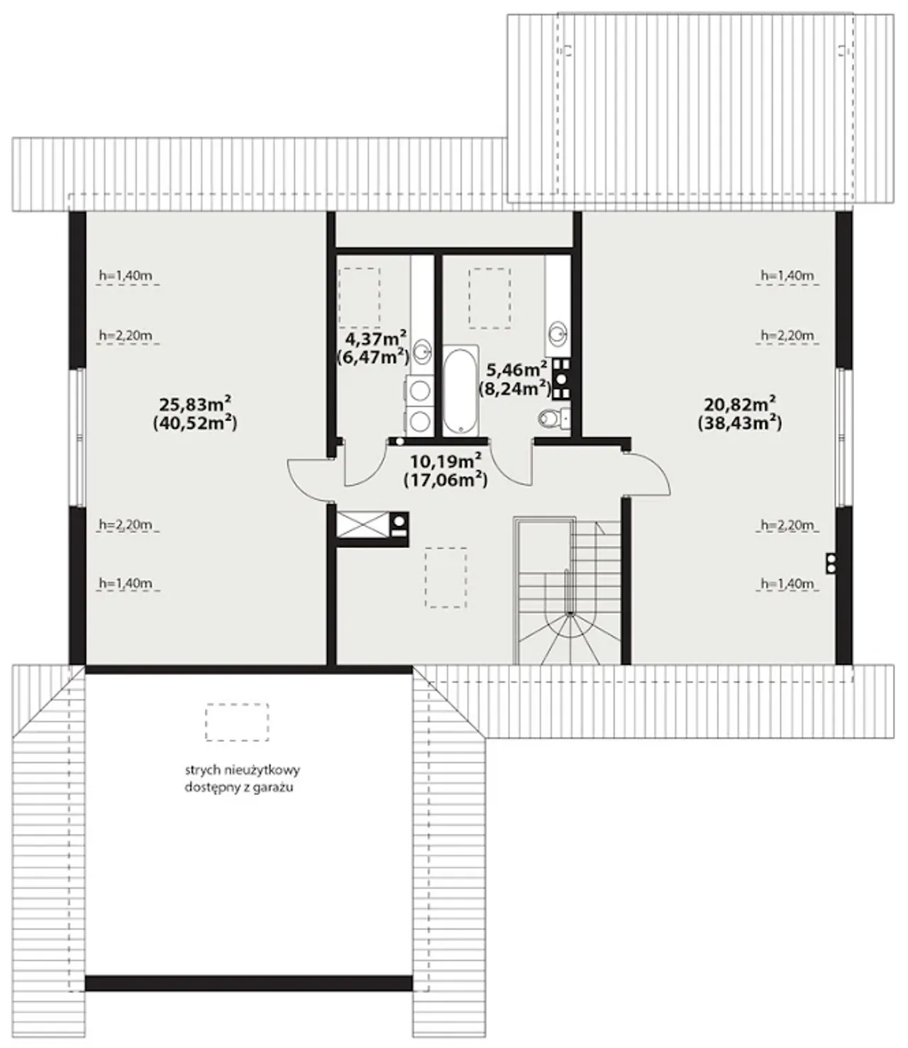 Na poddasze prowadzą wygodne schody zabiegowe.Przestrzeń można tam dowolnie zaaranżować ściankami G-K. Autor projektu Abra 3 drewniana proponuje dwie bardzo duże sypialnie lub open space tworzący połaczenie dwóch pokoi i hallu, a do tego łazienka z pralnią lub jedna duża łazienka.
