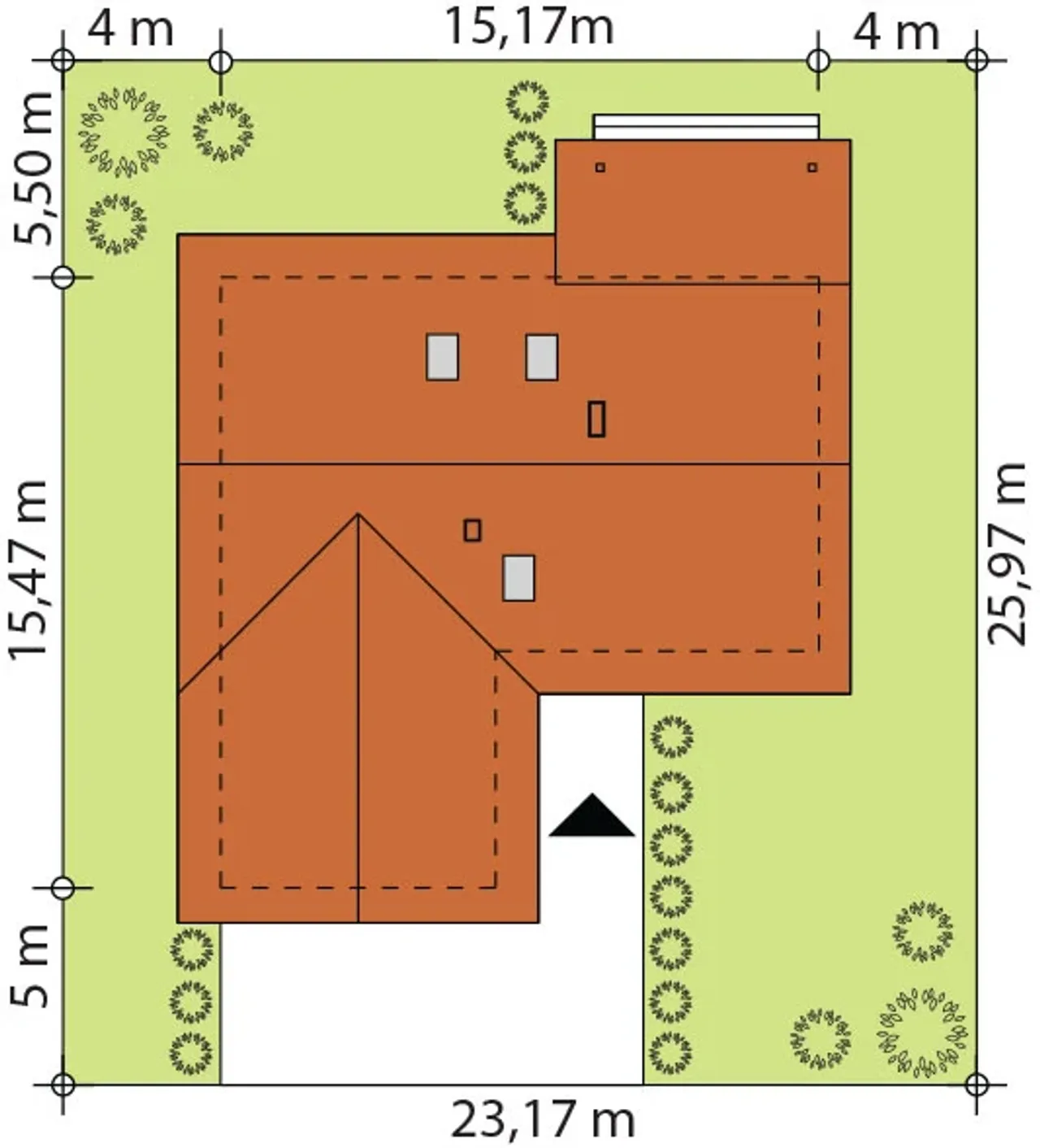 Niby prosty, ale ciekawy dom przykryty dachem dwuspadowym o głównej kalenicy równoległej do drogi, kalenica nad garażem - prostopadła.