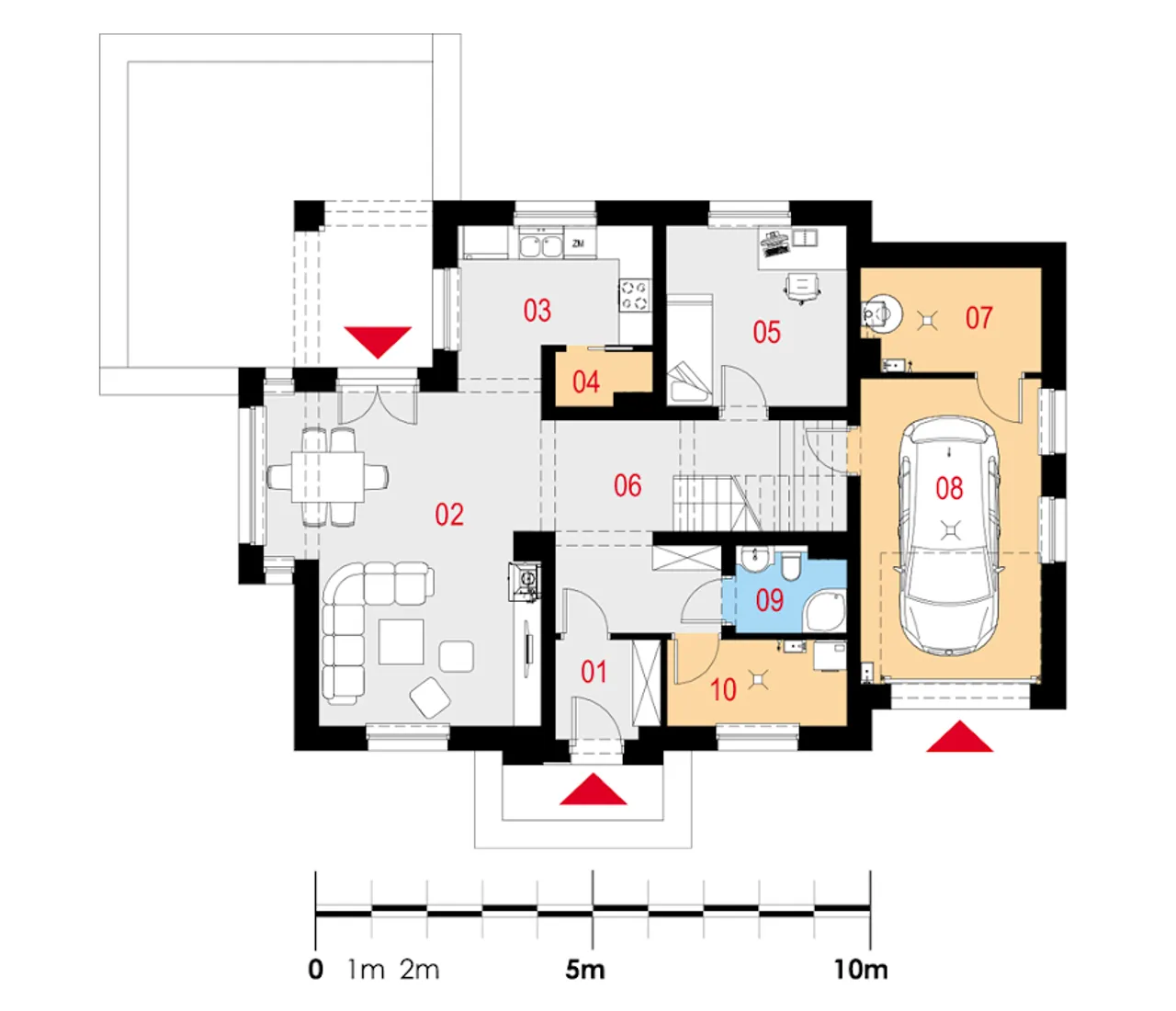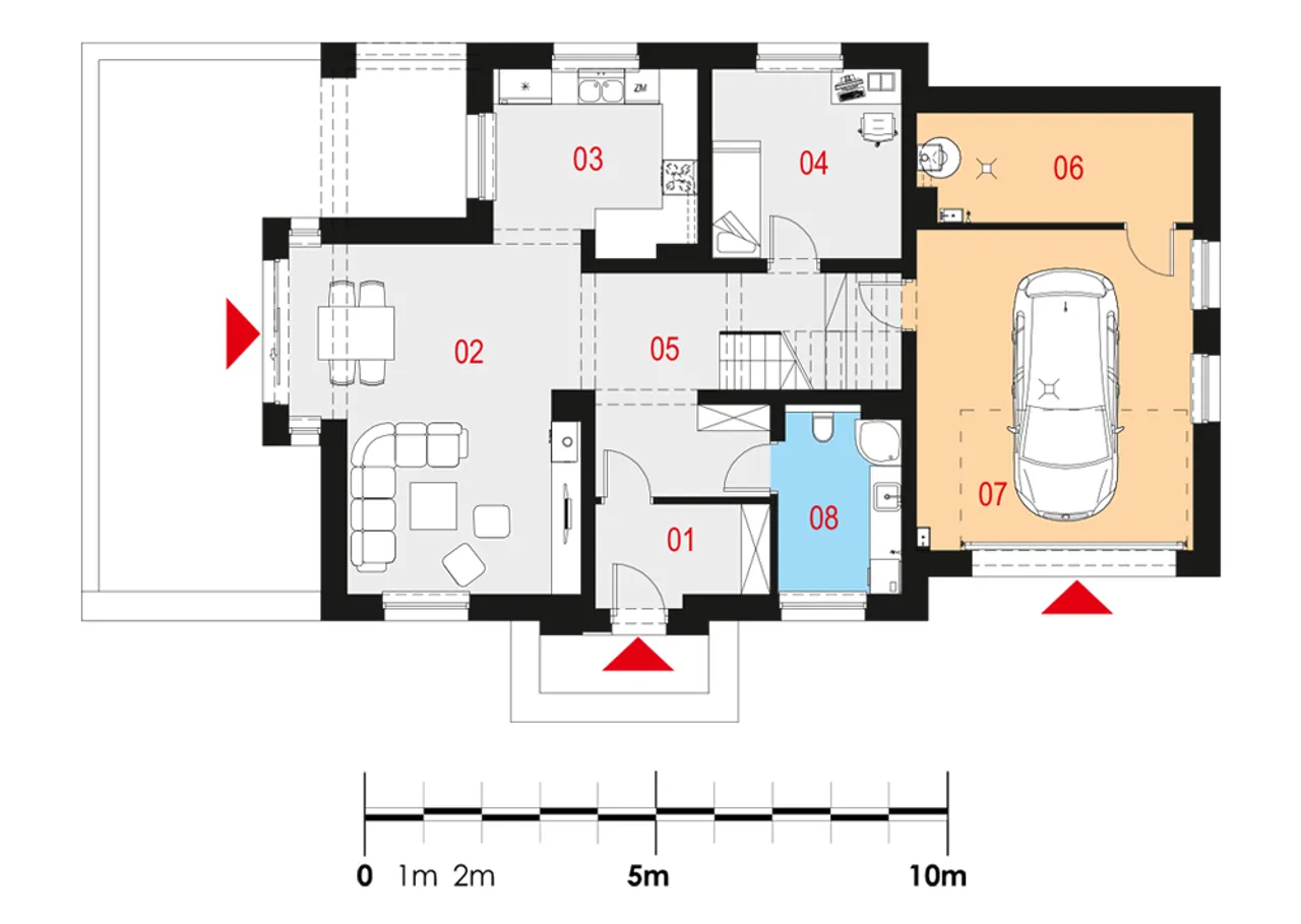Zewnętrzna stolarka PVC, rolety antywłamaniowe oraz segmentowa brama garażowa gwarantują bezpieczeństwo i spokój domowników. Wydzielona pralnia to wygodne miejsce na pralkę i suszarkę, a praktyczna spiżarnia w kuchni pozwala uporządkować najpotrzebniejsze produkty spożywcze. Nowoczesny dom murowany bez podpiwniczenia to szybka i ekonomiczna realizacja inwestycji.