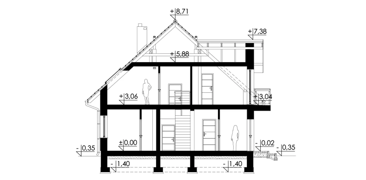 Bryła budynku wpisuje się w aktualne trendy architektoniczne - nowoczesny styl i dach dwuspadowy o kącie nachylenia 42° prezentują się niezwykle okazale. Żelbetowe schody łączące parter z poddaszem zapewniają nie tylko bezpieczeństwo, ale także elegancki detal konstrukcyjny, który podnosi wartość estetyczną wnętrz. Dodatkowo, zastosowanie ścian z pustaka ceramicznego o grubości 25 cm, warstwy termoizolacyjnej marki Termo Organika (20 cm) oraz solidnego tynku wpływa korzystnie na bilans energetyczny budynku.