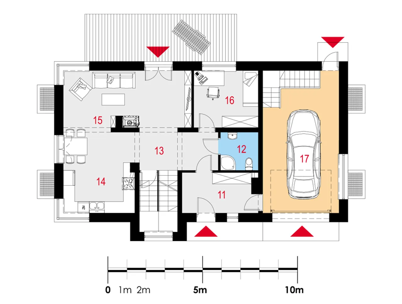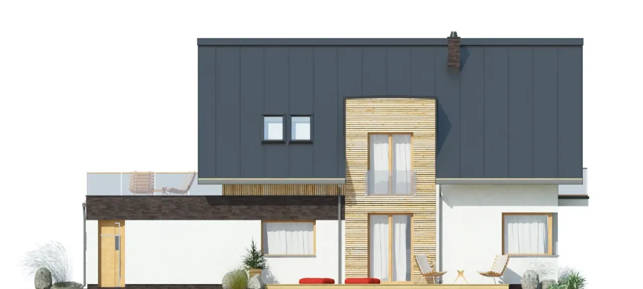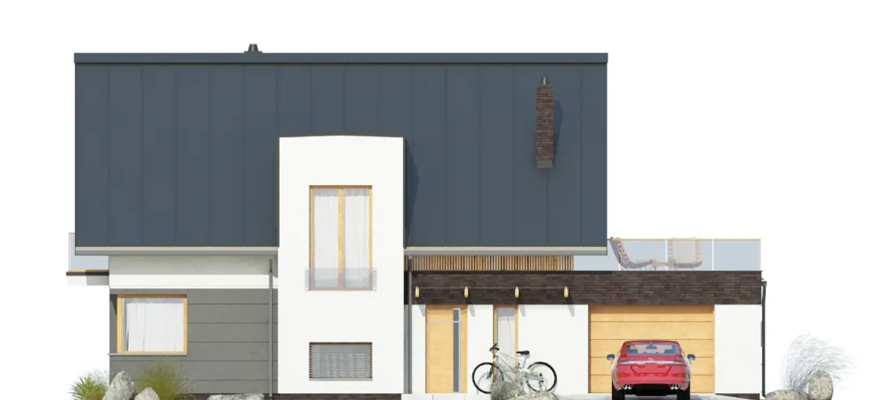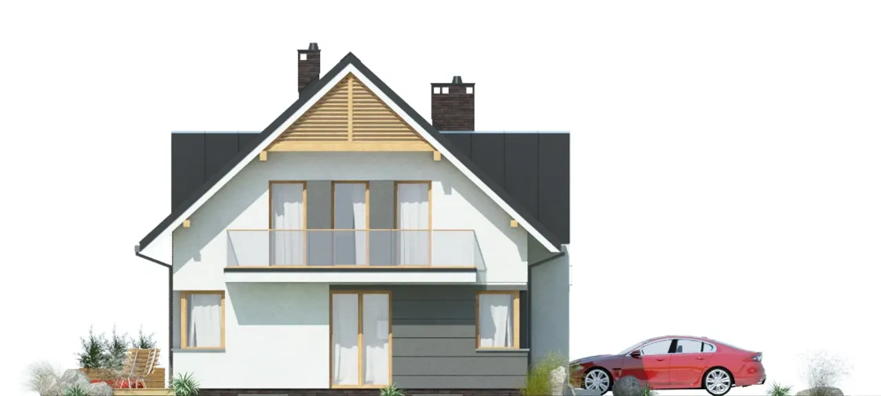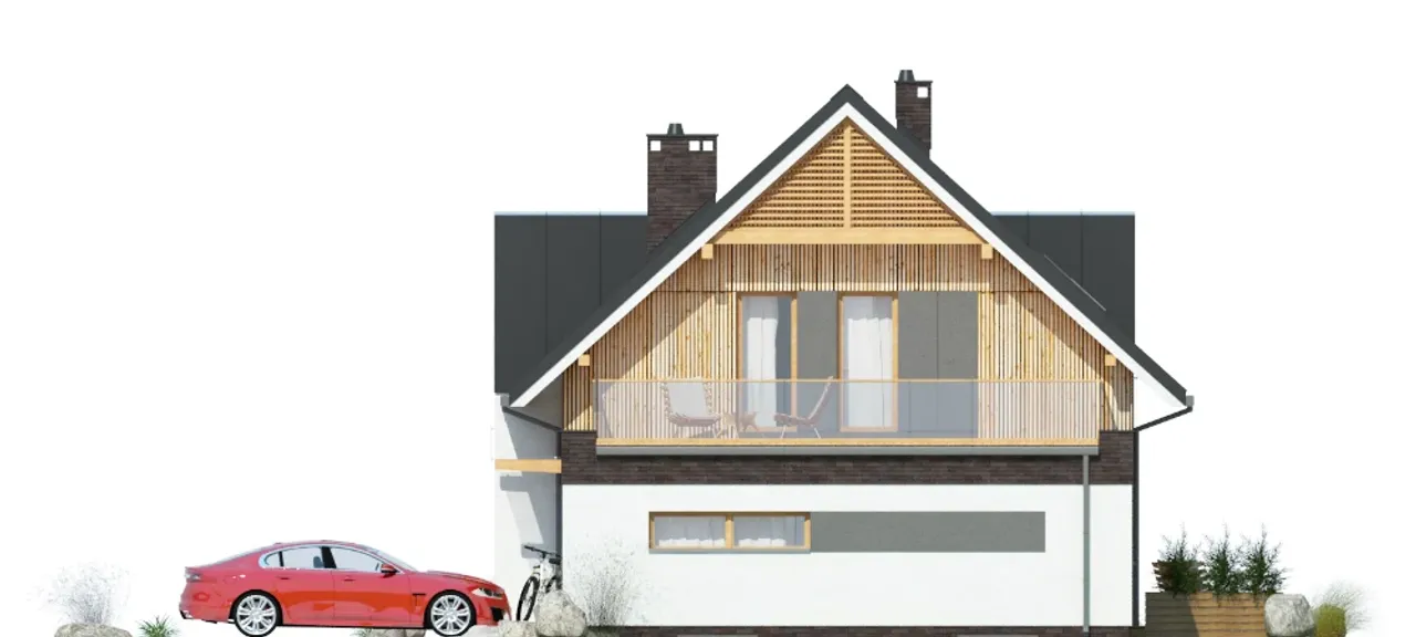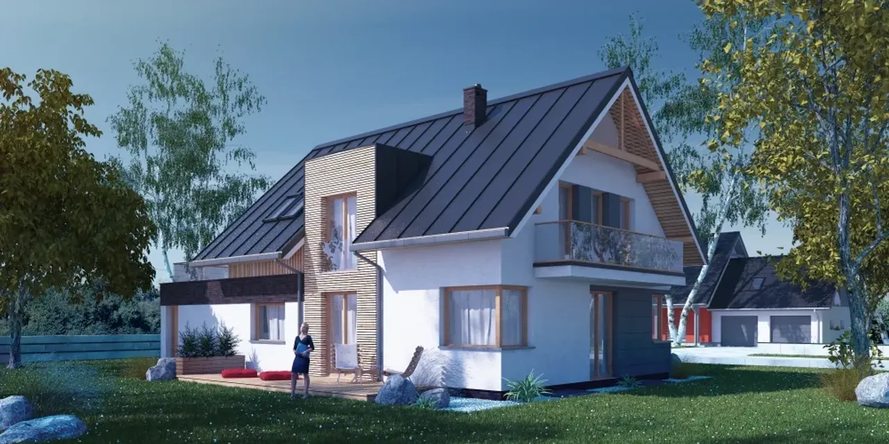 Dwuspadowy dach o kącie nachylenia 42° oraz płaskie lukarny nadają bryle wyjątkowy, współczesny sznyt. Elewacja wykończona tynkiem harmonizuje z dużymi oknami PVC z roletami i bramą garażową, podkreślając nowoczesny charakter domu. Strefa techniczna - duża kotłownia i garaż - została zaplanowana z myślą o łatwej obsłudze i oszczędności miejsca. Dom sprawdzi się zarówno w mieście, jak i poza miastem.