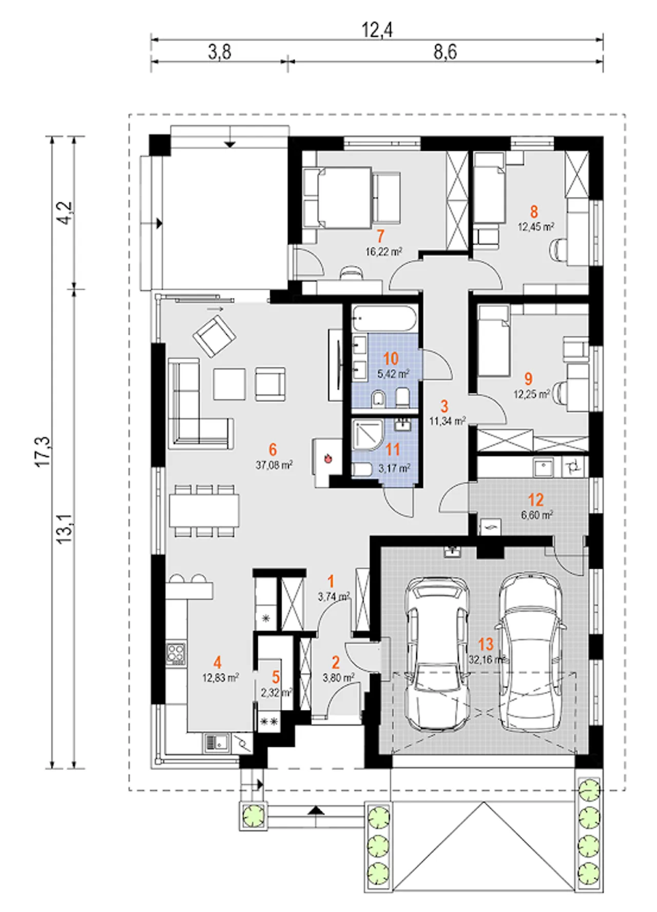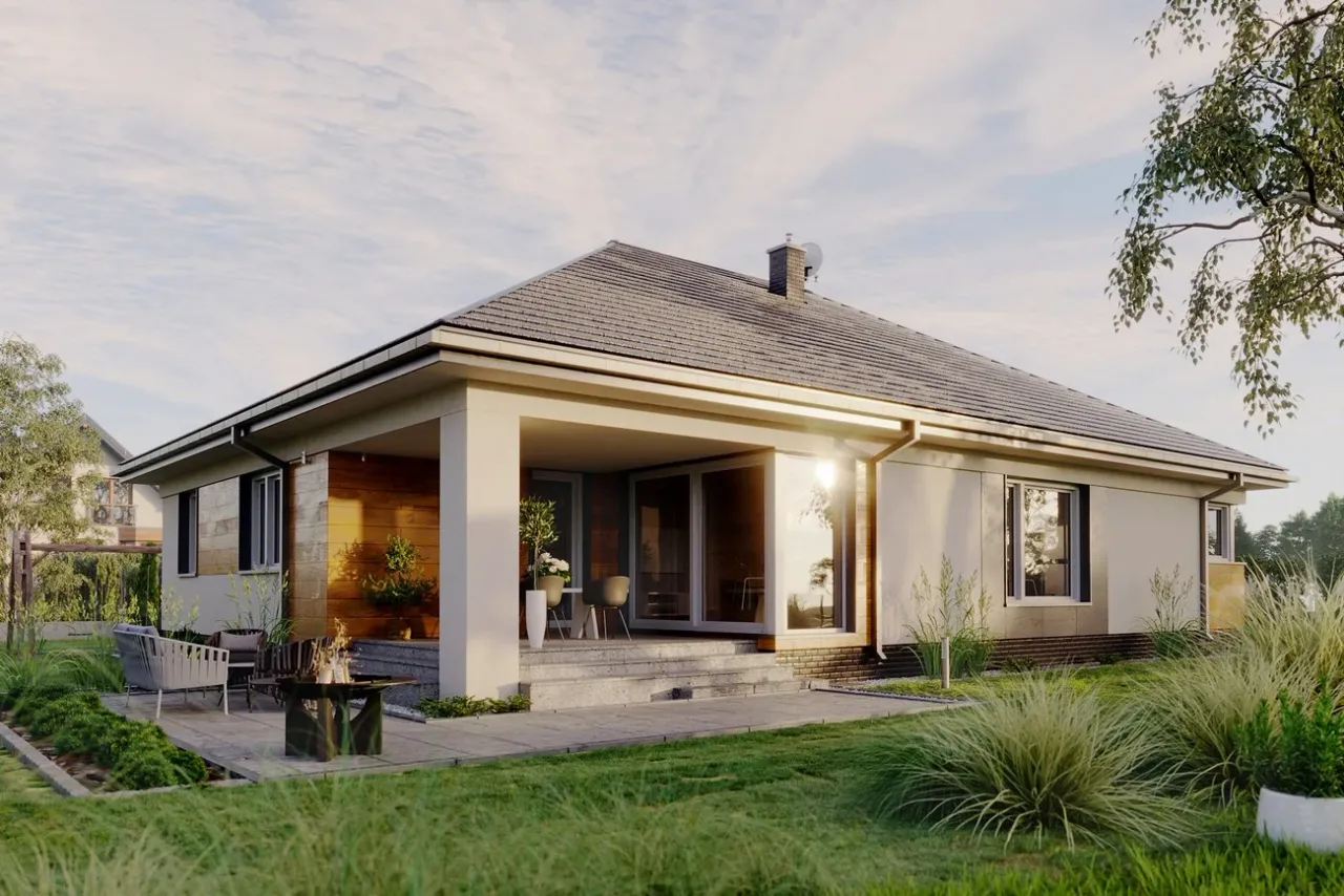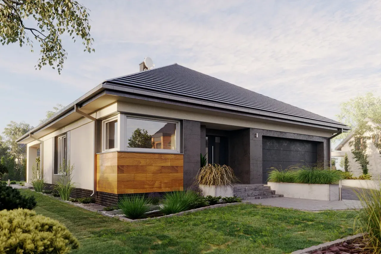 Projekt domu Adela to propozycja, która łączy funkcjonalność z nowoczesnym wyglądem. Przestronne wnętrze zapewnia doskonałe warunki do życia dla rodziny, a duże okna wprowadzają do środka dużo naturalnego światła, co sprawia, że przestrzeń wydaje się jeszcze większa. Estetyka projektu zachwyca prostotą i elegancją, jednocześnie odpowiadając na potrzeby współczesnych rodzin. Układ pomieszczeń został zaplanowany w taki sposób, aby ułatwić codzienne funkcjonowanie i stworzyć przyjazną atmosferę. Warto zwrócić uwagę na praktyczne rozwiązania, które mogą być przydatne dla różnorodnych potrzeb domowników.