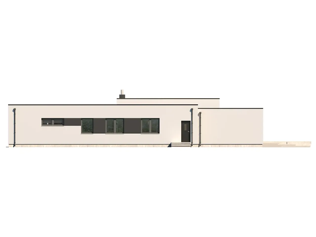 W tej eleganckiej i nowoczesnej bryle został uwzględniony optymalny układ pomieszczeń. W części dziennej znajduje się przestronny salon, otwarta jadalnia oraz kuchnia z spiżarnią. W części nocnej zaplanowano 4 sypialnie, z których każda ma dostęp do łazienki. Główna sypialnia dodatkowo dysponuje garderobą i osobną łazienką. W części gospodarczej przewidziano dwustanowiskowy garaż, kotłownię oraz toaletę z pralnią.