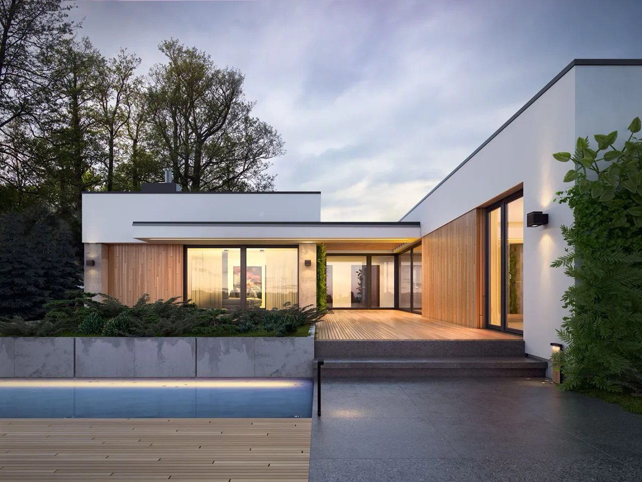 Elementem charakterystycznym dla bryły są przeszklenia, które występują w każdej części domu (dzienna, nocna i wejściowa). Tworzą one szerokie otwarcia na przestronne, częściowo zadaszone tarasy, a także kształtują formę budynku, włączając w to urokliwe "zielone" patio, które jest osłonięte pergolą.