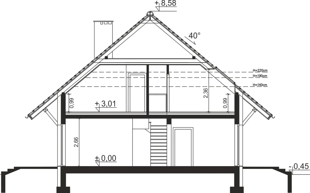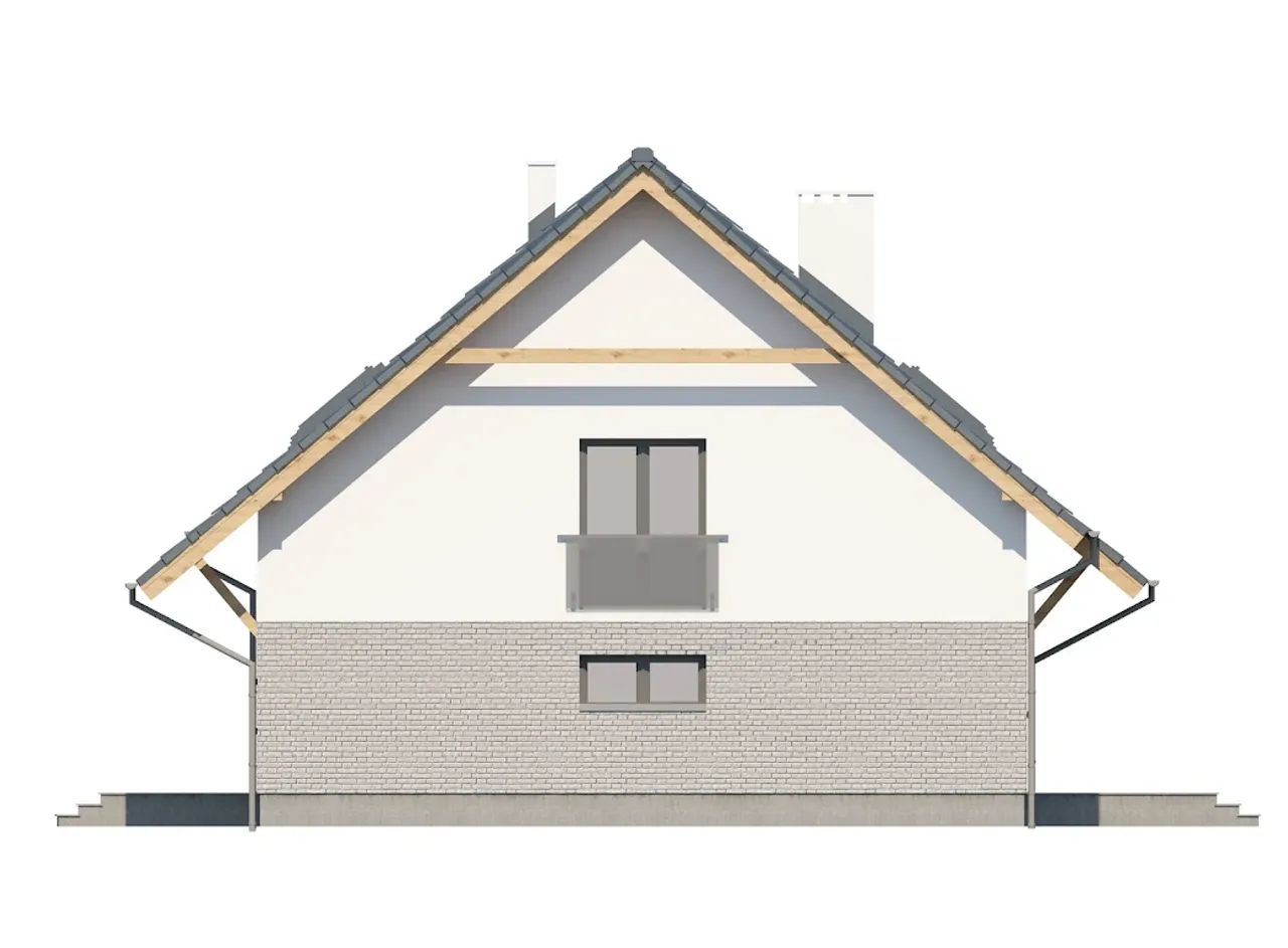 Dom wybudowany według projektu Ajaks 5 Max oferuje nowoczesny styl z tradycyjnym dwuspadowym dachem o kącie nachylenia 40°. Strop żelbetowy oraz ściany z betonu komórkowego z dodatkową izolacją 20 cm styropianu tworzą trwałą, energooszczędną konstrukcję. Fundamenty betonowe nadają solidności i odporności na zmienne warunki gruntowe, zaś drewniana więźba dachowa daje swobodę w wyborze pokrycia — od cementowej po ceramiczną dachówkę.