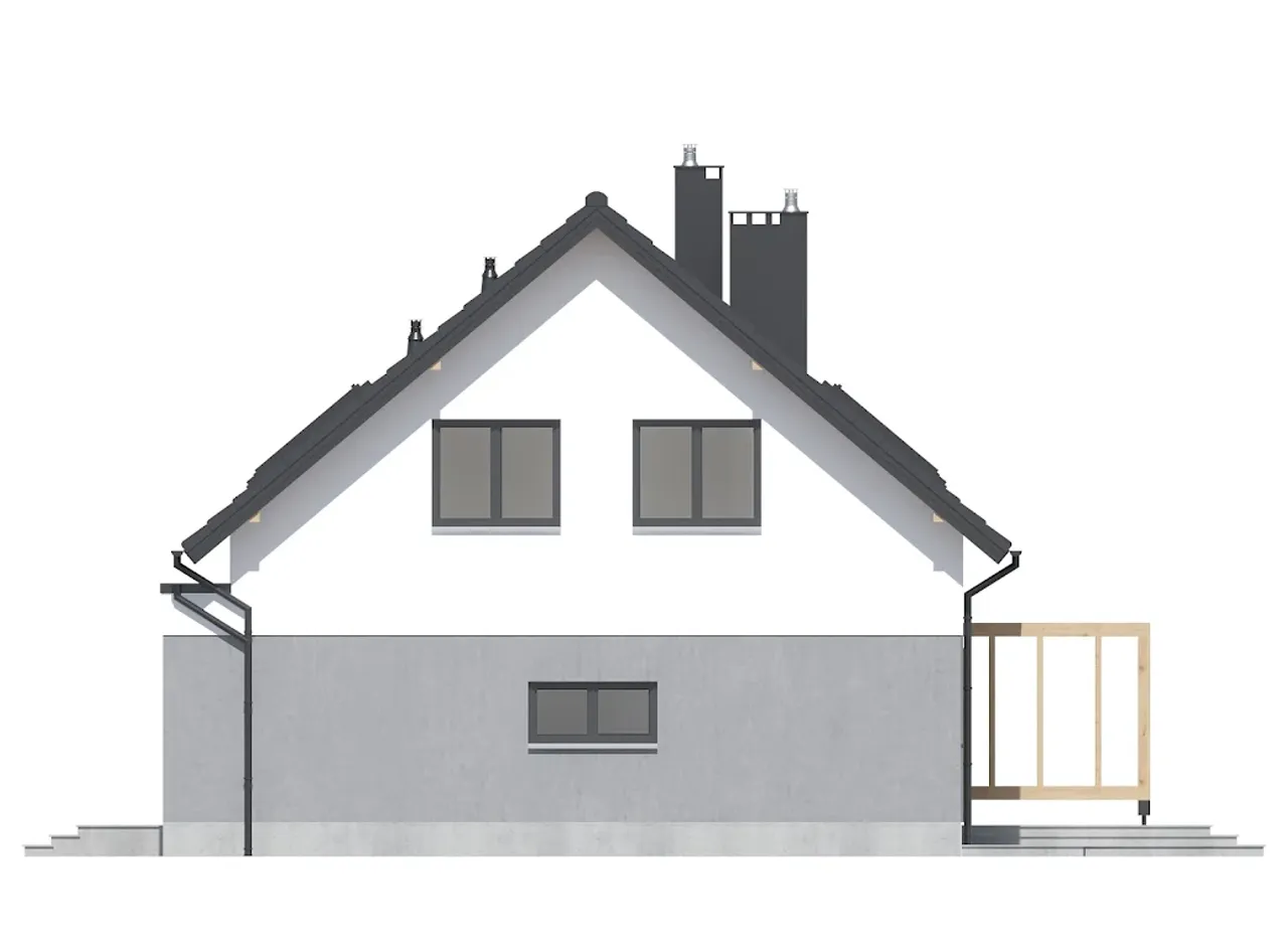 Budynek osadzony został na solidnych fundamentach betonowych. Ściany zewnętrzne wykonano w technologii dwuwarstwowej (24 cm bloczek + 20 cm ocieplenia), co pozytywnie wpływa na parametry izolacyjne. Konstrukcję dachu oparto na lekkiej więźbie drewnianej, wykończonej trwałą dachówką cementową bądź ceramiczną - wybór należy do Ciebie, dzięki czemu dopasujesz dom do własnych upodobań i budżetu. Praktyczna kalenica równoległa do drogi ułatwia lokalizację budynku na działce oraz optymalizuje nasłonecznienie wnętrz.