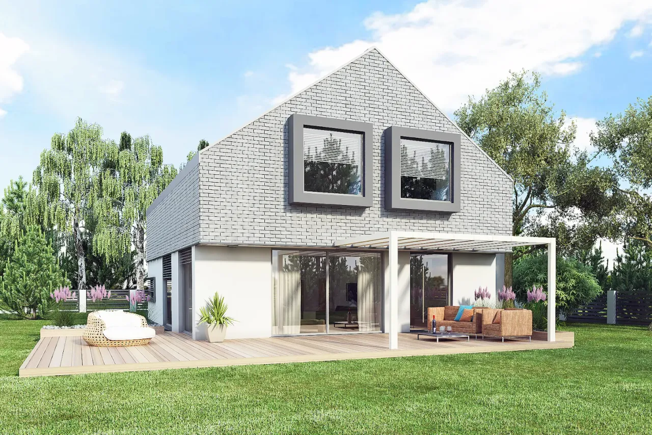 Projekt domu AJR 09 A2 to idealna propozycja dla osób poszukujących przestronnego i funkcjonalnego miejsca do życia. Dom charakteryzuje się nowoczesną architekturą z dwuspadowym dachem, wykonanym z drewnianej konstrukcji, pokrytym dachówką ceramiczną płaską w ciemnoszarym kolorze lub blachą na rąbek. Elewacja łączy w sobie tynk strukturalny z okładziną z cegły klinkierowej, co nadaje budynkowi elegancki i ponadczasowy wygląd. Stolarka zewnętrzna dostępna jest w opcjach PVC, aluminiowej lub drewnianej, co pozwala na dopasowanie do indywidualnych preferencji.