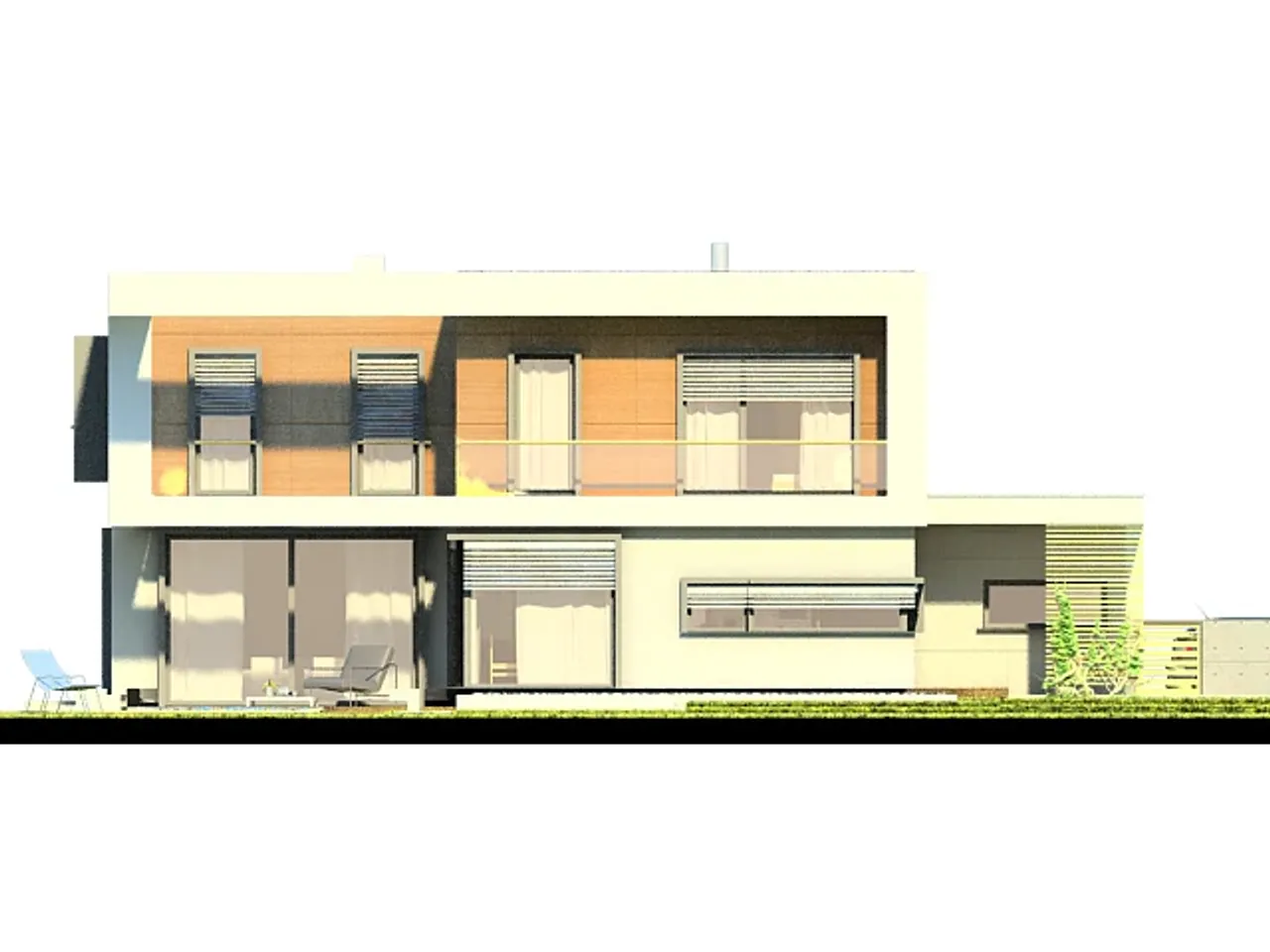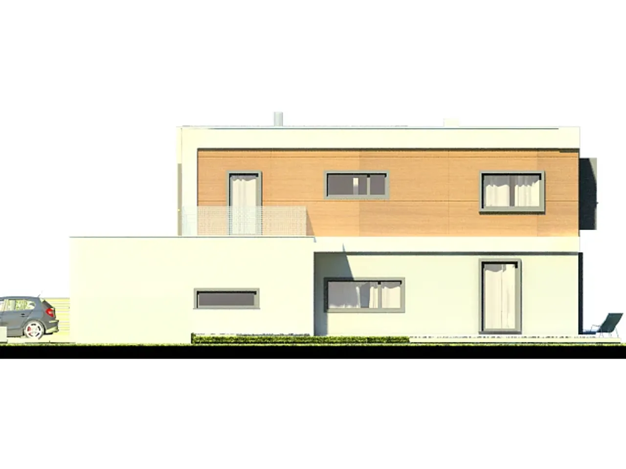 Styl budynku określany jako wille i rezydencje podkreśla jego prestiżowy charakter, a płaski dach dodaje mu nowoczesności. Projekt ten jest doskonałym wyborem dla osób ceniących sobie połączenie nowoczesnego designu z funkcjonalnością i komfortem życia.