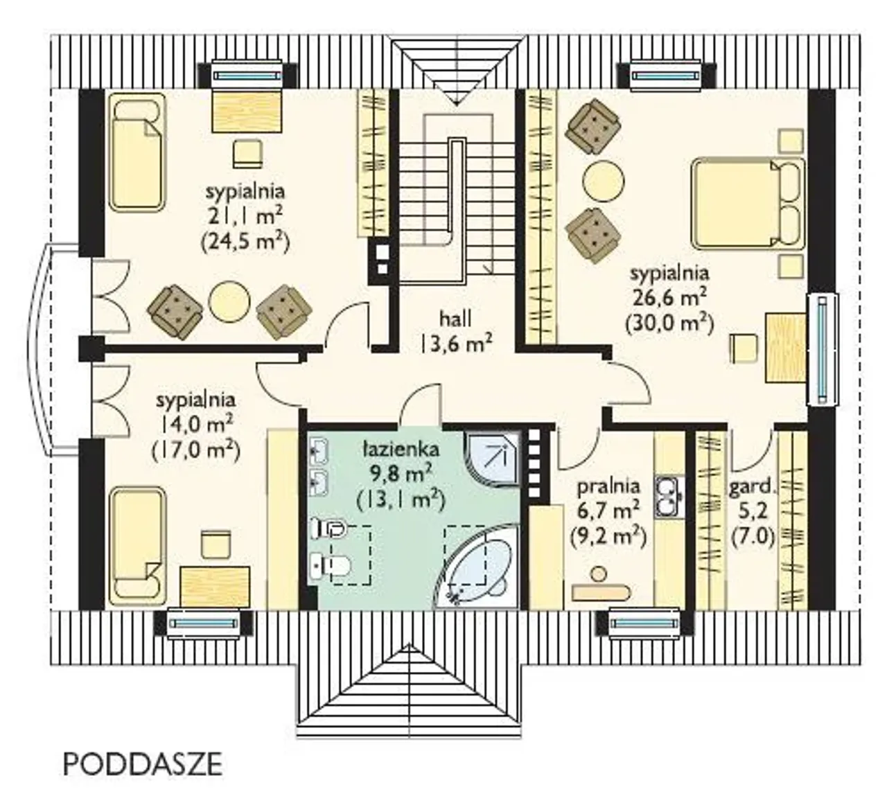 Na poddaszu znajduje się sypialnia małżeńska z osobną garderobą oraz dwie sypialnie, z których obie mają wyjście na balkon. Dodatkowo na poddaszu przewidziano wspólną łazienkę oraz pralnię, co sprawia, że jest to kompletna i funkcjonalna przestrzeń dla całej rodziny.