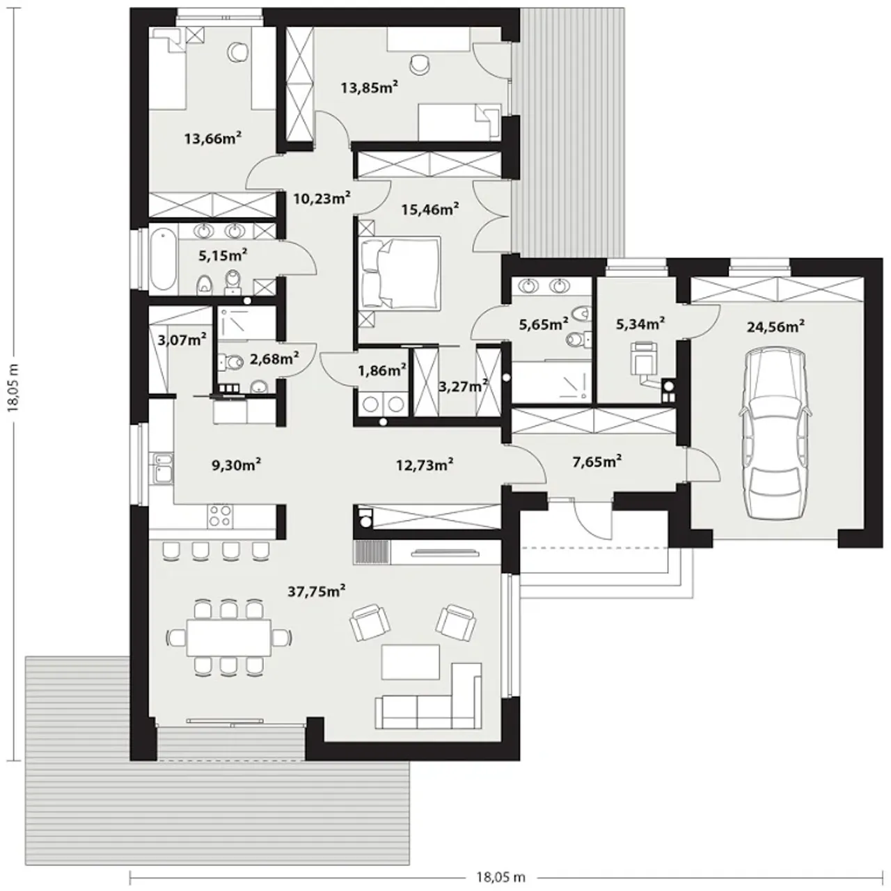 Przedstawiony gotowy projekt domu całorocznego Alani będzie domem parterowym, z garażem jednostanowiskowym. W dokumentacji projektu przewidziano kominek. Dom Alani będzie mógł zostać wykonany w technologii tradycyjnej - murowanej. Autor proponuje jako podstawowe źródło ogrzewania gaz, z opcjonalną, alternatywną możliwością zastosowania pieca na paliwo stałe. Alani będzie domem niepodpiwniczonym, jeśli inwestor we własnym zakresie nie zleci doprojektowania piwnicy. Przewidziano tu dach dwuspadowy o kącie nachylenia 35 stopni. Na rzutach zaplanowano trzy łazienki. Projekt domu Alani prezentuje się bardzo ciekawie, jego nowoczesna elewacja i styl wykończenia, przykłują uwagę również bardzo wymagających inwestorów.