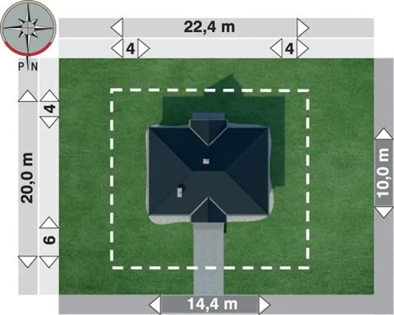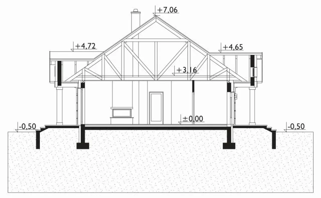 - rzut dachu - ukazuje jego kształt, wymiary, kąt nachylenia połaci, rozmieszczenie okien połaciowych, lukarn, świetlików i rur spustowych, pokazuje rozmieszczenie kominów i informuje o sposobie odwodnienia: rozmieszczeniu i rozmiarach rynien