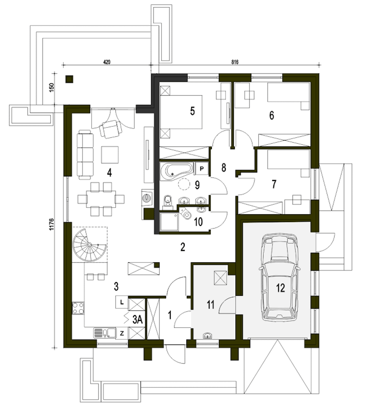Wypełnij formularz i otrzymaj rysunki w pdf z dokładnymi wymiarami budynku i pomieszczeń (długość, szerokość, wysokość) dla projektu Alf II z garażem 1-st. A