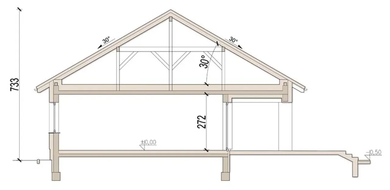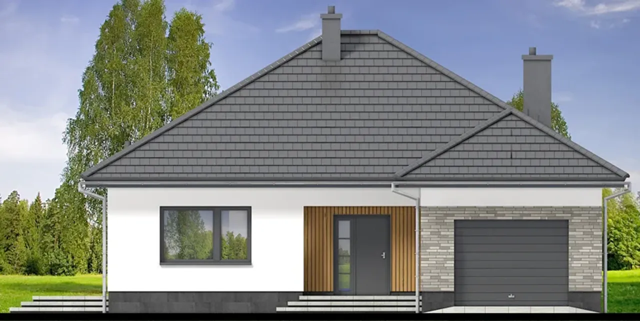 Nowoczesny dach wielospadowy z kątem nachylenia 30° gwarantuje świetną ochronę przed warunkami atmosferycznymi i tworzy elegancką sylwetkę domu. Drewniana konstrukcja dachu podkreśla tradycyjny charakter, a możliwość wyboru pokrycia - dachówka betonowa lub ceramiczna - daje swobodę aranżacji elewacji. W projekcie zaplanowano garaż jednostanowiskowy, co istotnie zwiększa funkcjonalność, szczególnie dla rodzin prowadzących aktywny tryb życia.