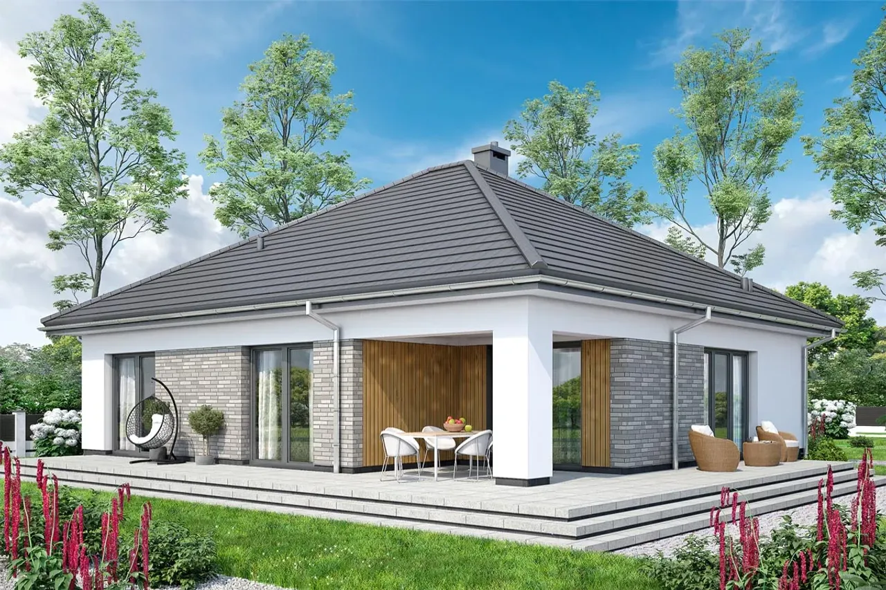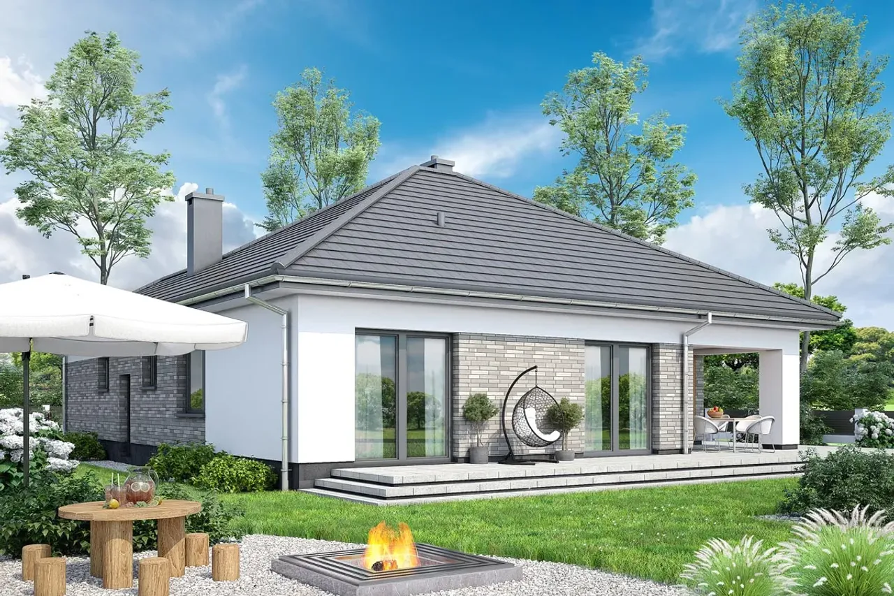 Projekt domu Aloes G1 powstał z myślą o rodzinach, które szukają gotowego, energooszczędnego i bezpiecznego rozwiązania. Konstrukcja oparta na fundamentach żelbetowych zwiększa trwałość i stabilność budynku, a ściany z pustaków ceramicznych zapewniają zdrowy mikroklimat wnętrza. Parterowy układ ułatwia codzienne funkcjonowanie, sprawdzi się zarówno dla rodzin z dziećmi, jak i osób starszych. Odpowiednia liczba czterech pokoi pozwala zorganizować sypialnię, gabinet oraz pokój dziecięcy lub gościnny, dostosowując dom do własnych potrzeb.
