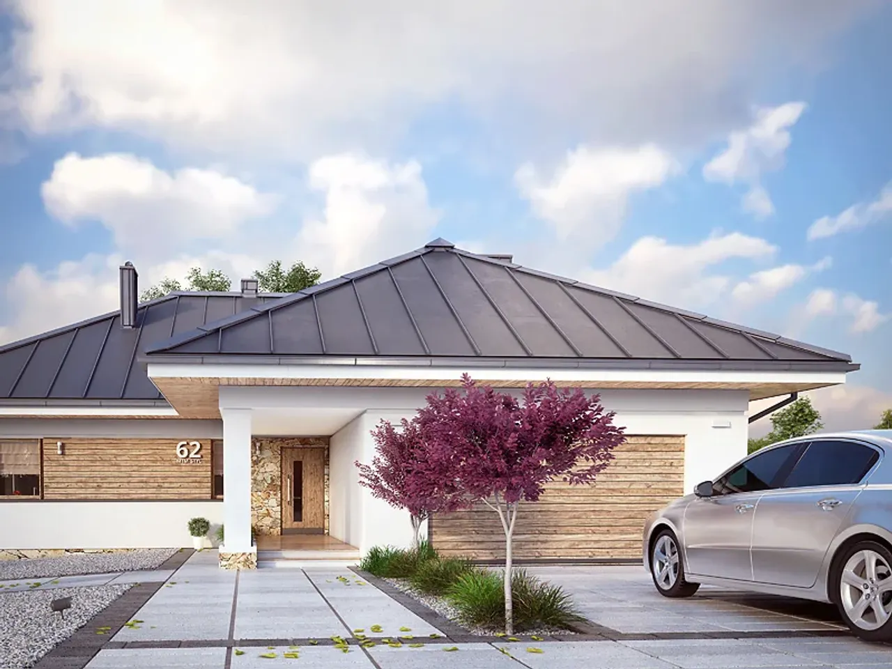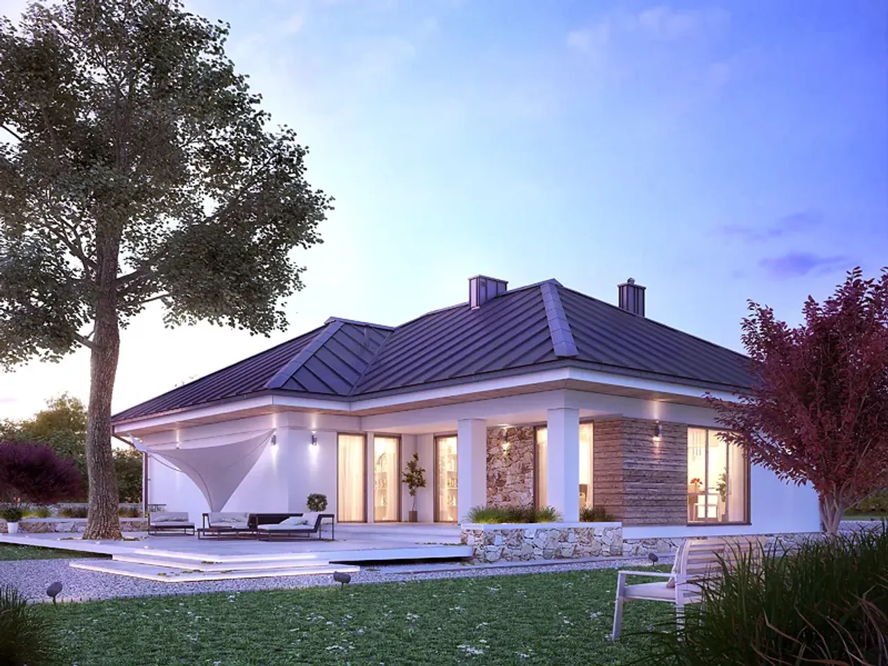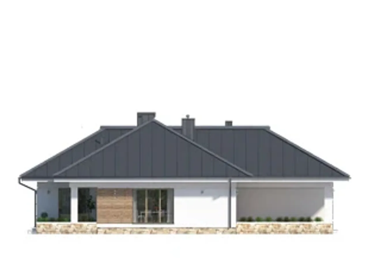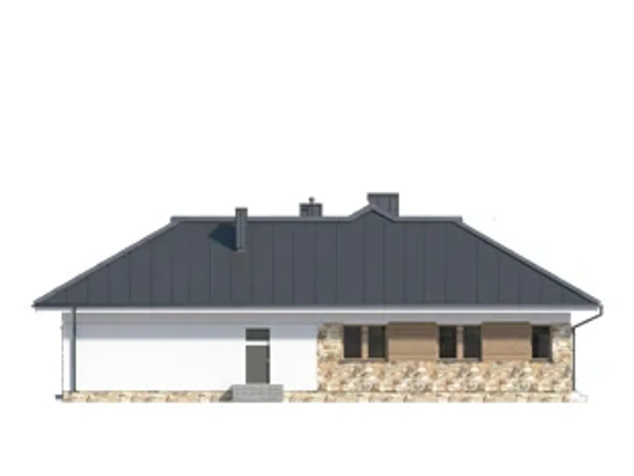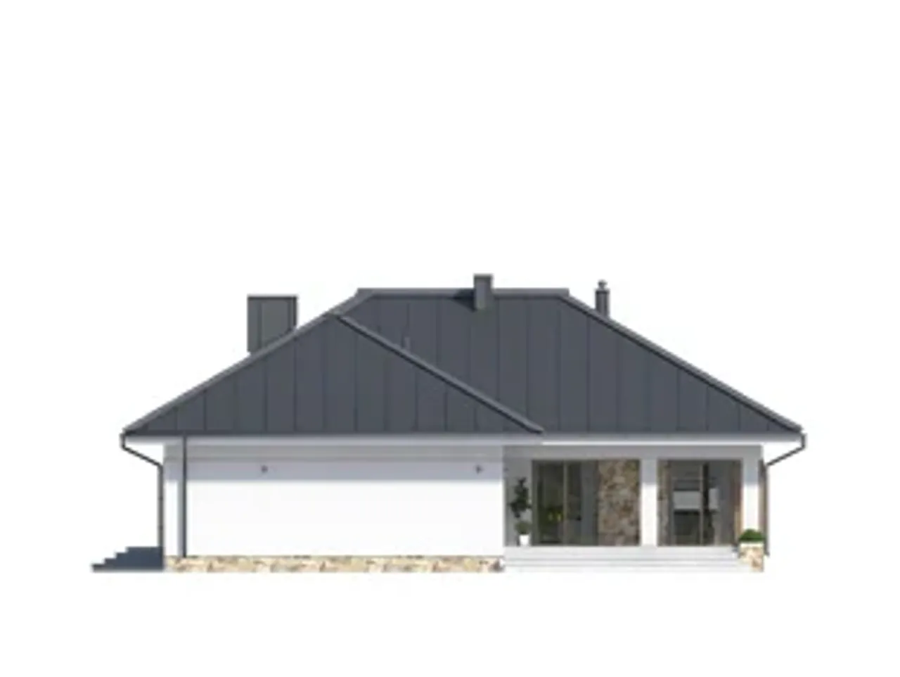 Gotowy projekt domu Ambrozja 8 to parterowy dom preznaczony dla czteroosobowej rodziny. Projekt charakteryzuje przestronne wnętrze podzielone na część dzienna i bardziej intymną część nocną. Obok salonu zlokalizowana jest otwarta kuchnia. Ponadto, projekt domu Ambrozja 8 oferuje szereg pomieszczeń pomocniczych, takich jak garderoba, spiżarnia oraz pomieszczenie gospodarcze. Zadaszony taras pozwala na przebywanie na świeżym powietrzu niezależnie od warunków atmosferycznych.