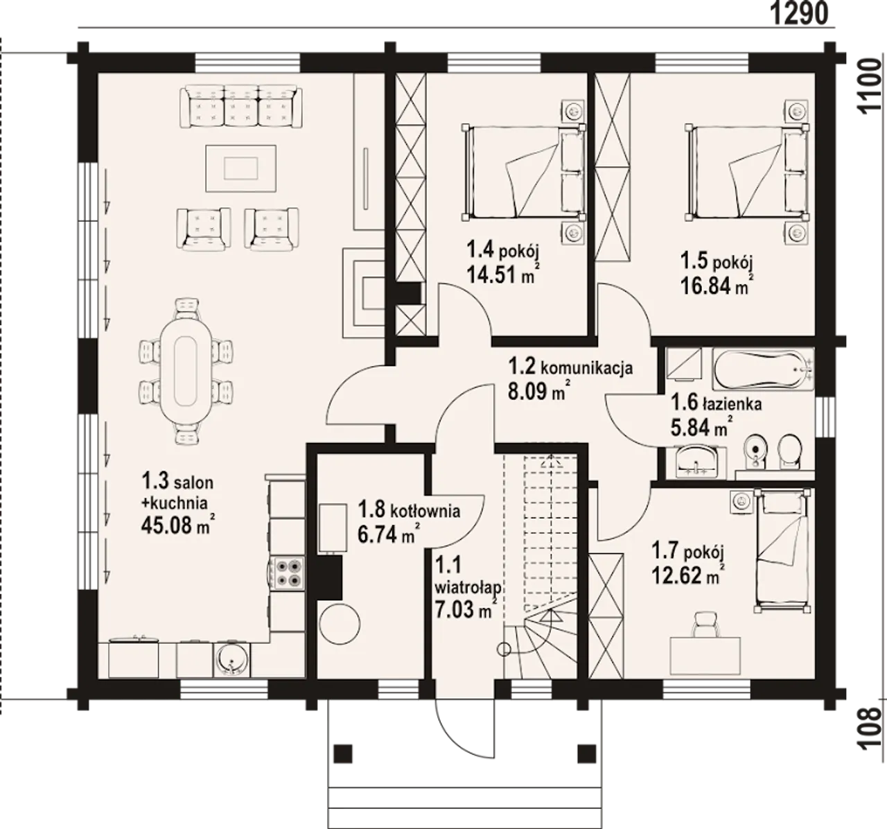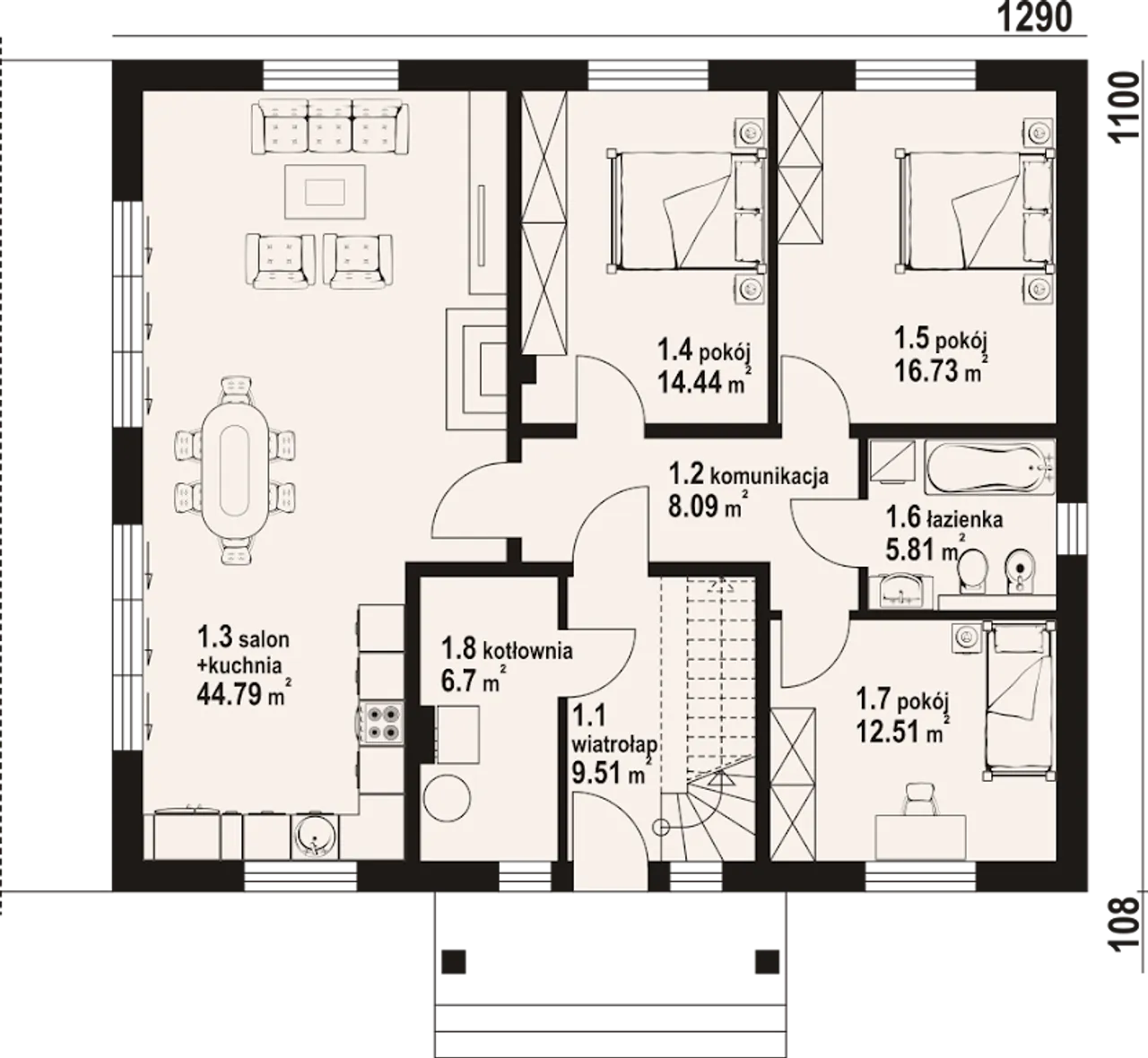 Wypełnij formularz i otrzymaj rysunki w pdf z dokładnymi wymiarami budynku i pomieszczeń (długość, szerokość, wysokość) dla projektu Andrzejowo 1dw