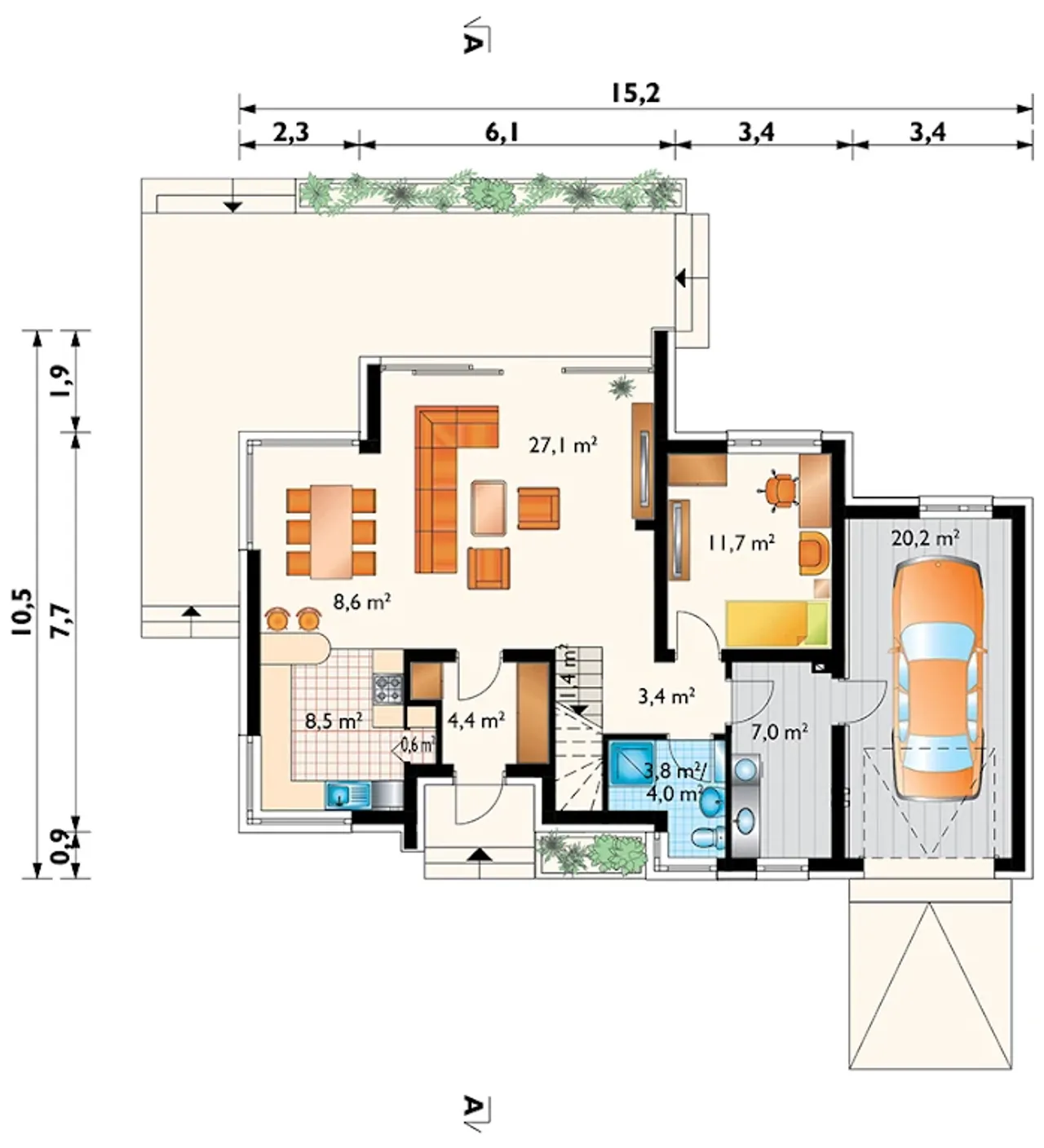 - rzut dachu - ukazuje jego kształt, wymiary, kąt nachylenia połaci, rozmieszczenie okien połaciowych, lukarn, świetlików i rur spustowych, pokazuje rozmieszczenie kominów i informuje o sposobie odwodnienia: rozmieszczeniu i rozmiarach rynien