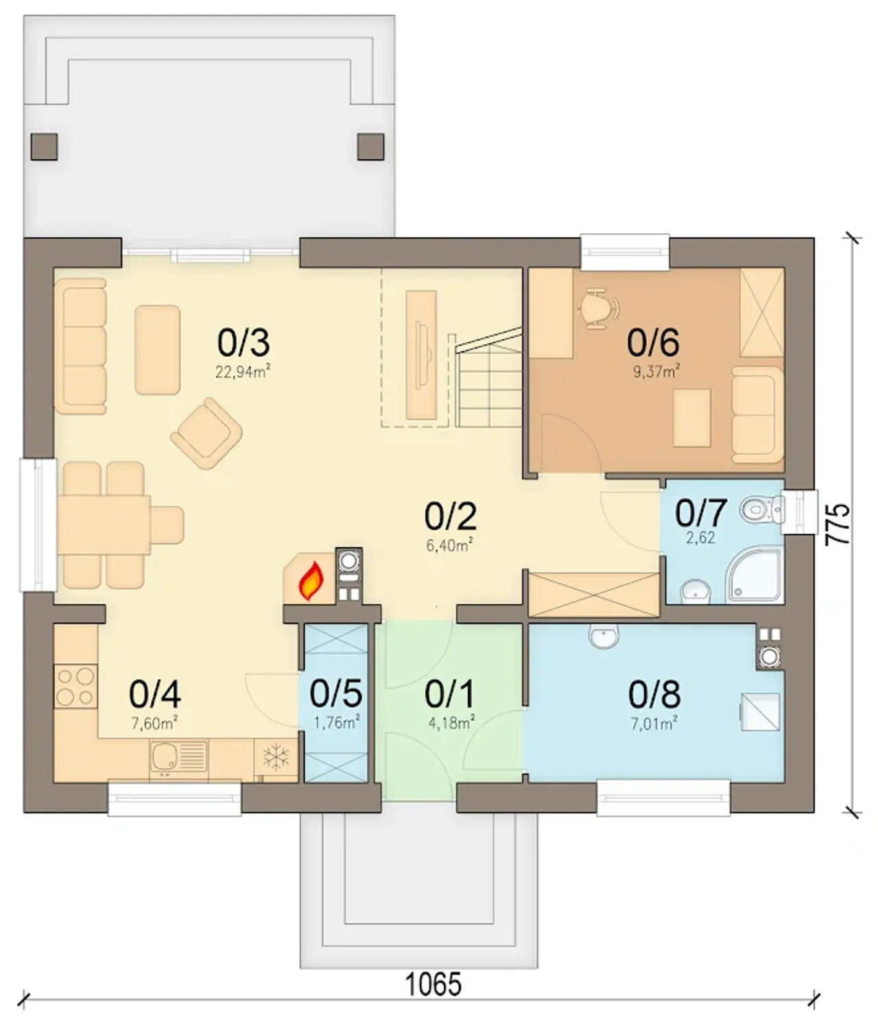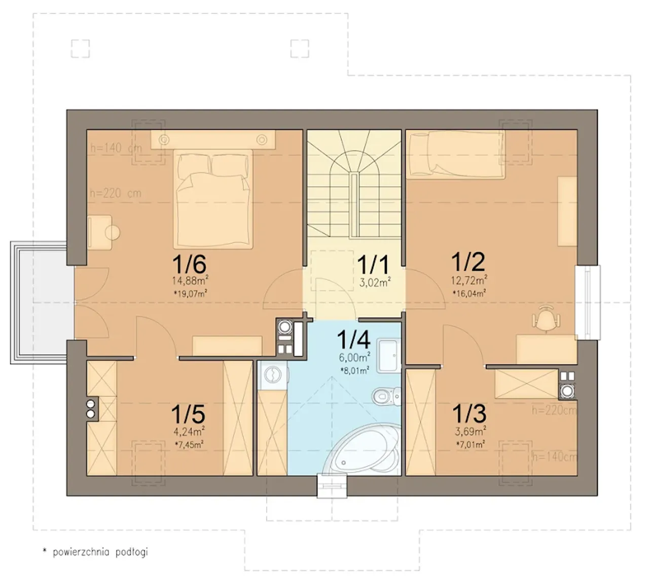 Projekt jest propozycją dla tych, którzy chcą mieszkać wygodnie i bezpiecznie. Kondygnacja w postaci parteru oraz poddasza daje elastyczność aranżacyjną oraz wyraźny podział na część dzienną i prywatną. Cztery ustawne pokoje tworzą komfortowe warunki zarówno do odpoczynku, jak i pracy. Kalenica zorientowana równolegle do drogi pozwala na swobodne usytuowanie budynku względem działki. Brak podpiwniczenia ułatwia wykonanie fundamentów żelbetowych, redukując czas oraz koszt budowy.