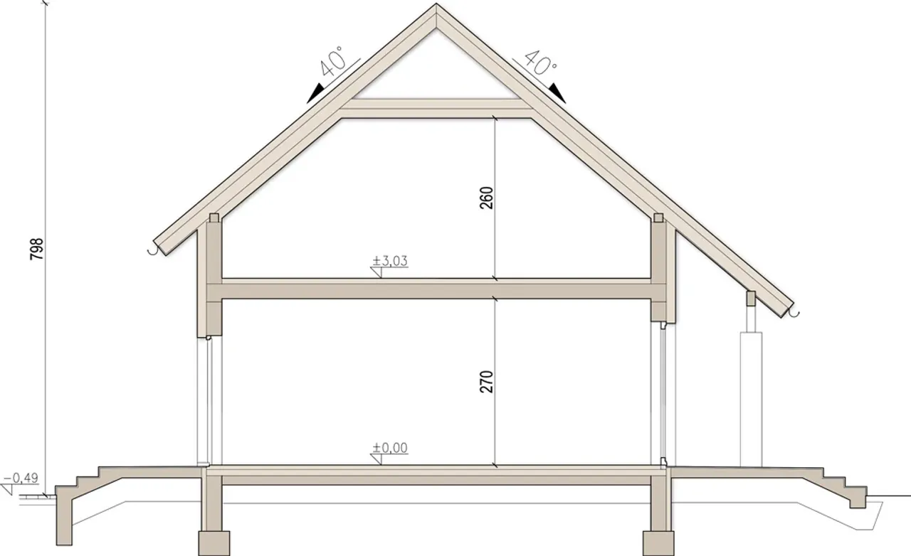 Dom wybudowany na podstawie tego projektu będzie solidnym i estetycznym wyborem dla tych, którzy cenią uniwersalne rozwiązania oraz sprawdzone technologie. Kąt nachylenia dachu 40° i dwuspadowa konstrukcja nadają budynkowi ponadczasowego charakteru, a naturalne materiały budowlane zwiększają trwałość i bezpieczeństwo.
