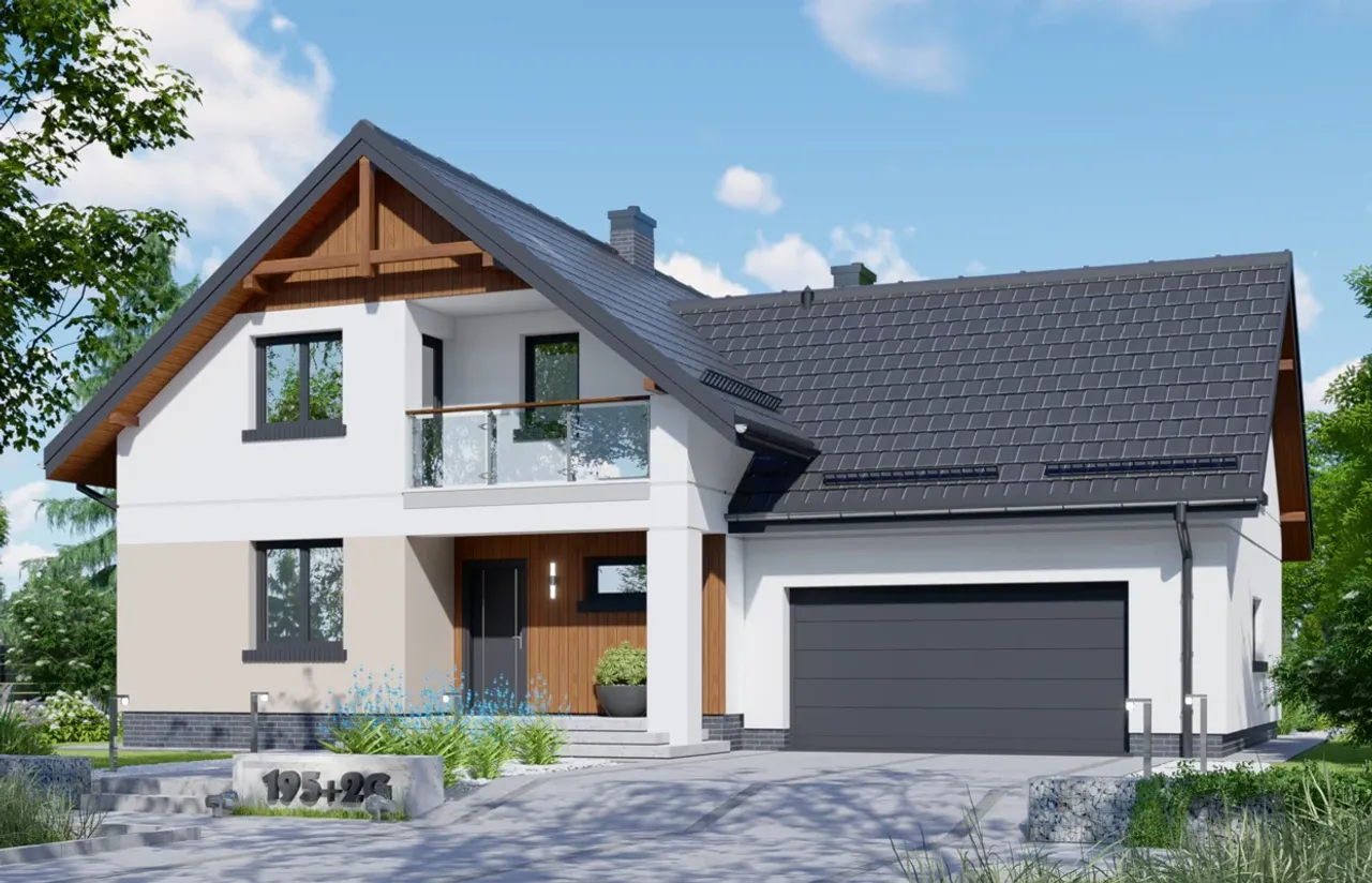 Projekt domu, znany jako APS 195+2G, to atrakcyjna propozycja dla osób poszukujących przestronnego i funkcjonalnego domu jednorodzinnego. Bryła budynku jest nowoczesna, a jednocześnie nawiązuje do klasycznych rozwiązań architektonicznych. Projekt charakteryzuje się dobrze przemyślanym układem pomieszczeń, co zapewnia wygodę dla domowników. Dodatkowym atutem jest dwustanowiskowy garaż, który z pewnością spełni oczekiwania osób zmotoryzowanych. Wnętrza zaprojektowano z myślą o maksymalnym wykorzystaniu dostępnej przestrzeni, co sprawia, że dom jest niezwykle funkcjonalny. Propozycja ta zasługuje na uwagę każdej rodziny marzącej o własnym domu.