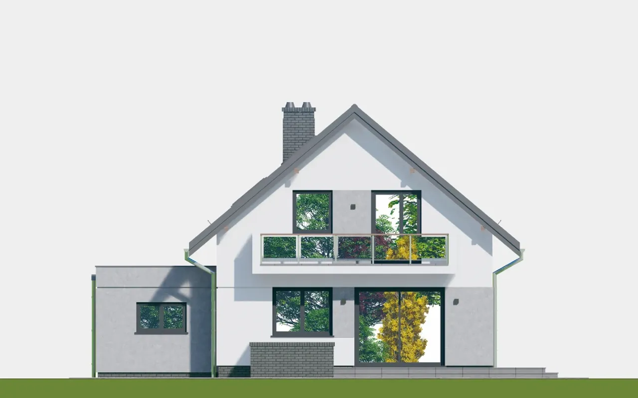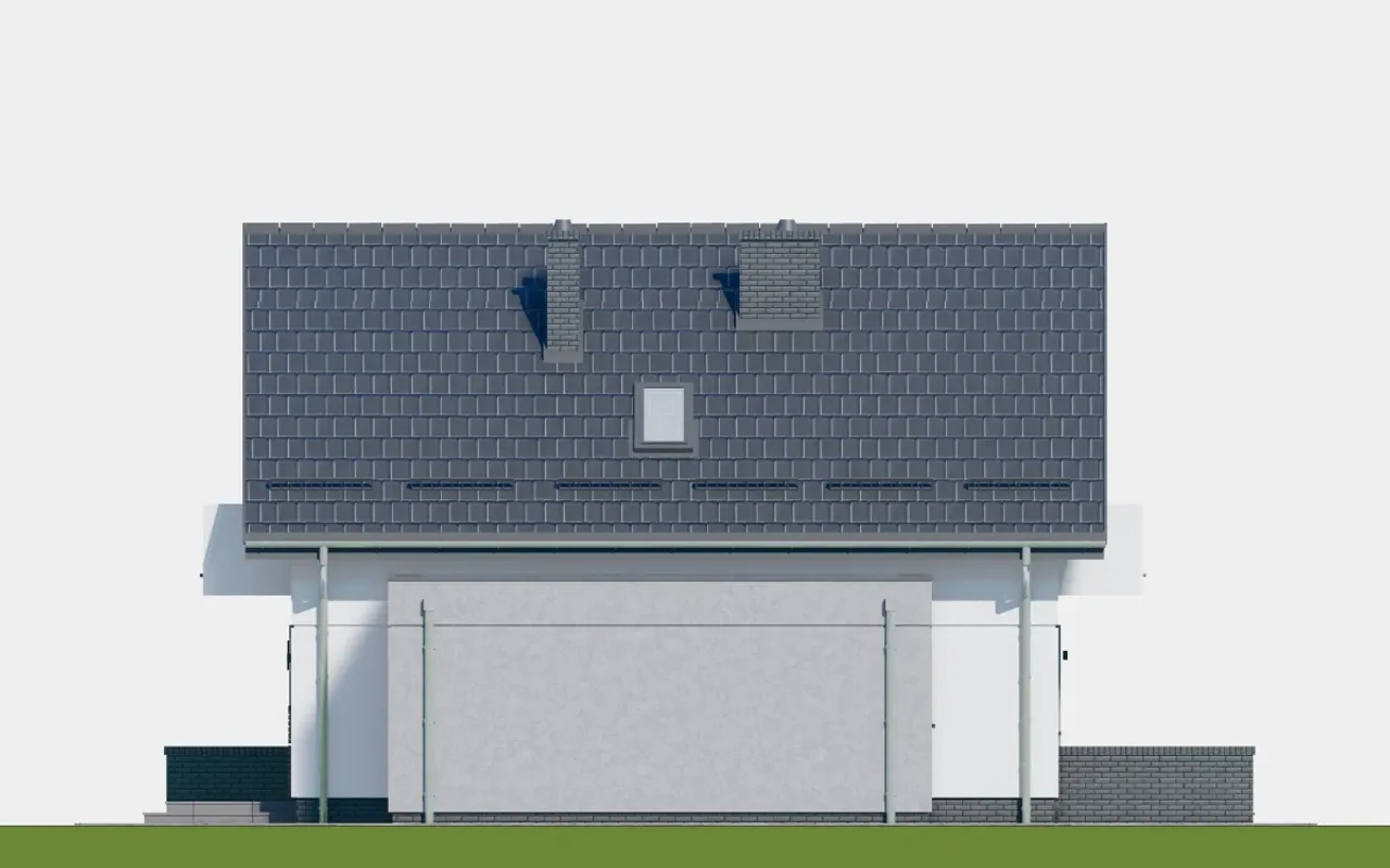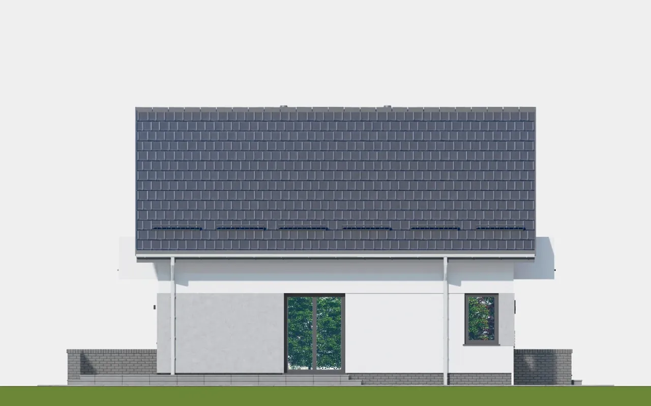Nowoczesny charakter bryły dopełnia stonowana kolorystyka tynku mineralnego i czytelne linie połaci dachowych. Dom wybudowany na podstawie tego projektu harmonijnie wpasuje się zarówno w osiedla nowych domów jednorodzinnych, jak i w luźniejszą zabudowę na terenach wiejskich, gdzie liczy się ponadczasowa estetyka.