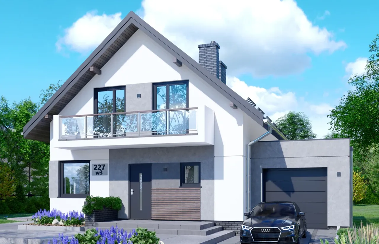 Projekt APS 227 wariant 3 ECO to nowoczesny dom jednorodzinny z poddaszem, który łączy prostą bryłę, energooszczędne rozwiązania i wygodny układ dla 4-5-osobowej rodziny. Przemyślany rzut, tradycyjny dach dwuspadowy i eleganckie wykończenie tworzą spójną, estetyczną całość, idealną zarówno do podmiejskiej zabudowy, jak i mniejszych miejscowości.