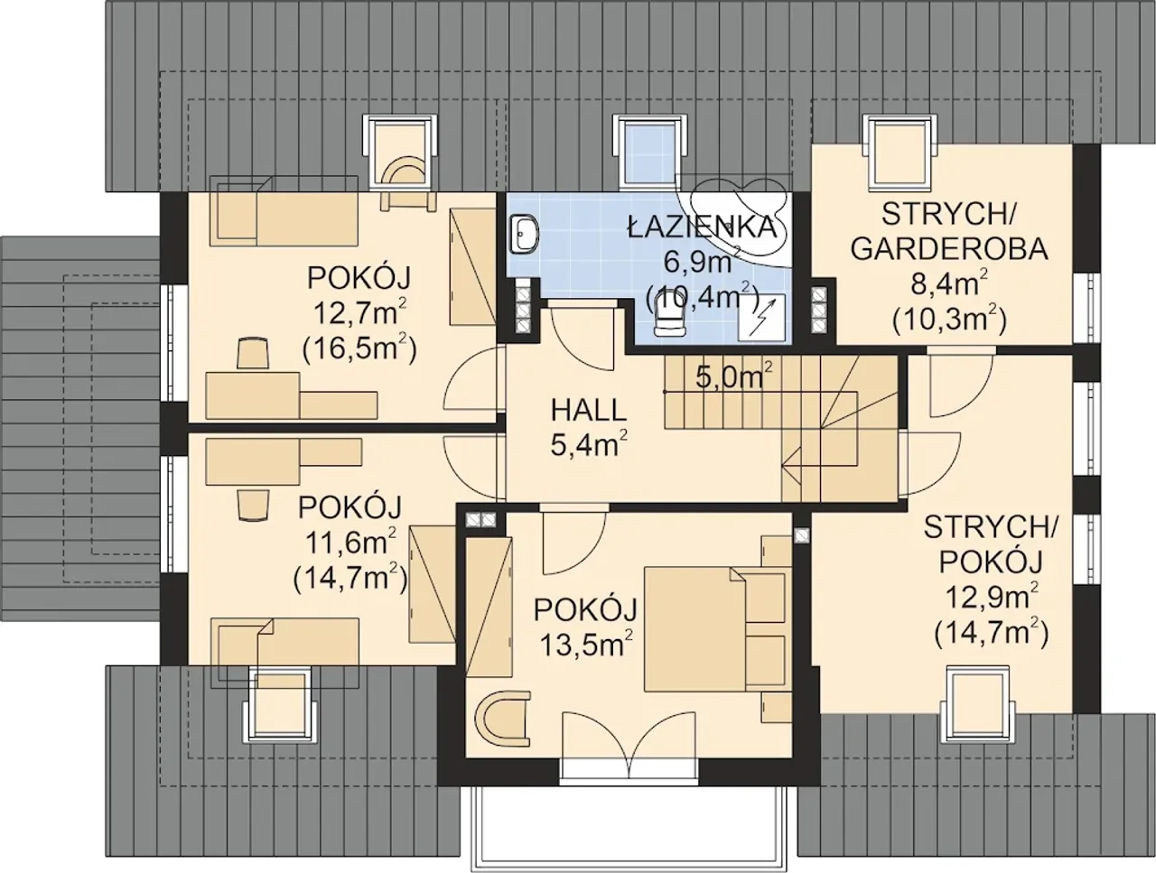 | 6. Strych / pokój | 12,90 (14,70) m² |