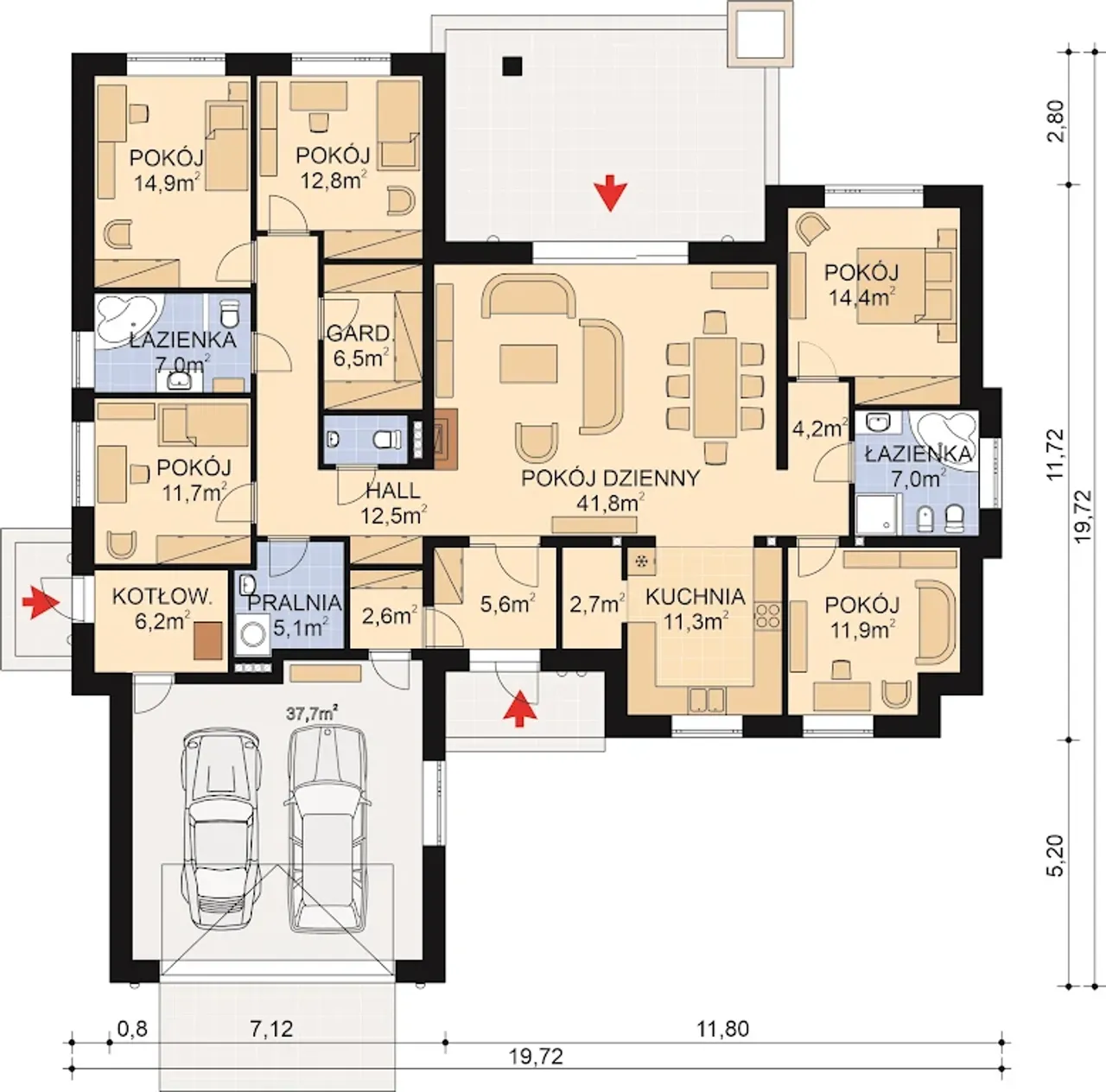 Wypełnij formularz i otrzymaj rysunki w pdf z dokładnymi wymiarami budynku i pomieszczeń (długość, szerokość, wysokość) dla projektu APS 265 wariant 2