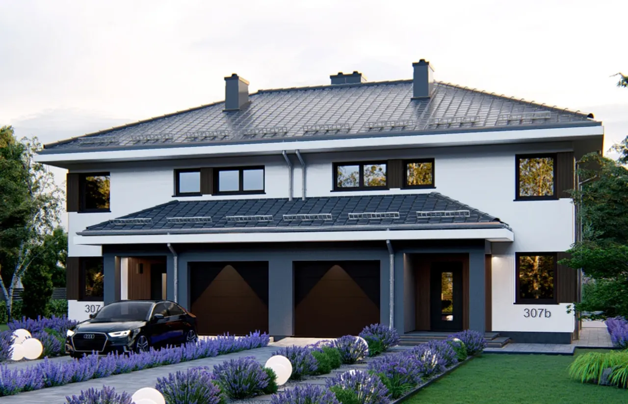 Wypełnij formularz i otrzymaj rysunki w pdf z dokładnymi wymiarami budynku i pomieszczeń (długość, szerokość, wysokość) dla projektu APS 307 wariant 3 dwulokalowy