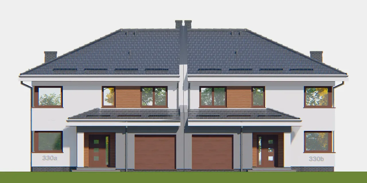 Wypełnij formularz i otrzymaj rysunki w pdf z dokładnymi wymiarami budynku i pomieszczeń (długość, szerokość, wysokość) dla projektu APS 330 wariant 2 bliźniaczy
