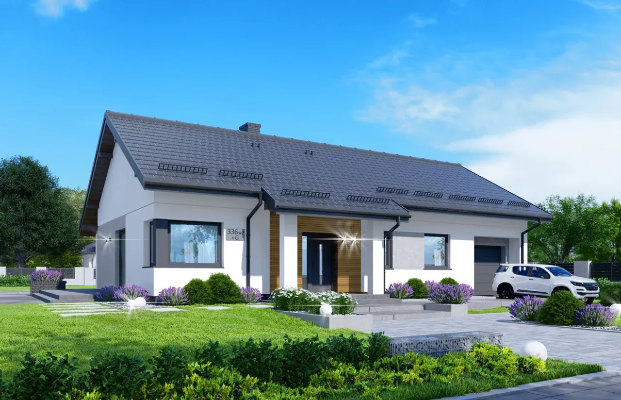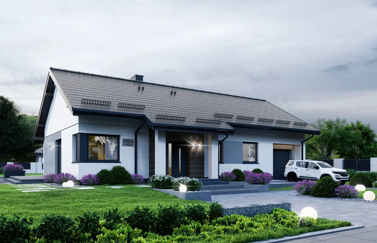 Wypełnij formularz i otrzymaj rysunki w pdf z dokładnymi wymiarami budynku i pomieszczeń (długość, szerokość, wysokość) dla projektu APS 336 wariant 2 + G ECO