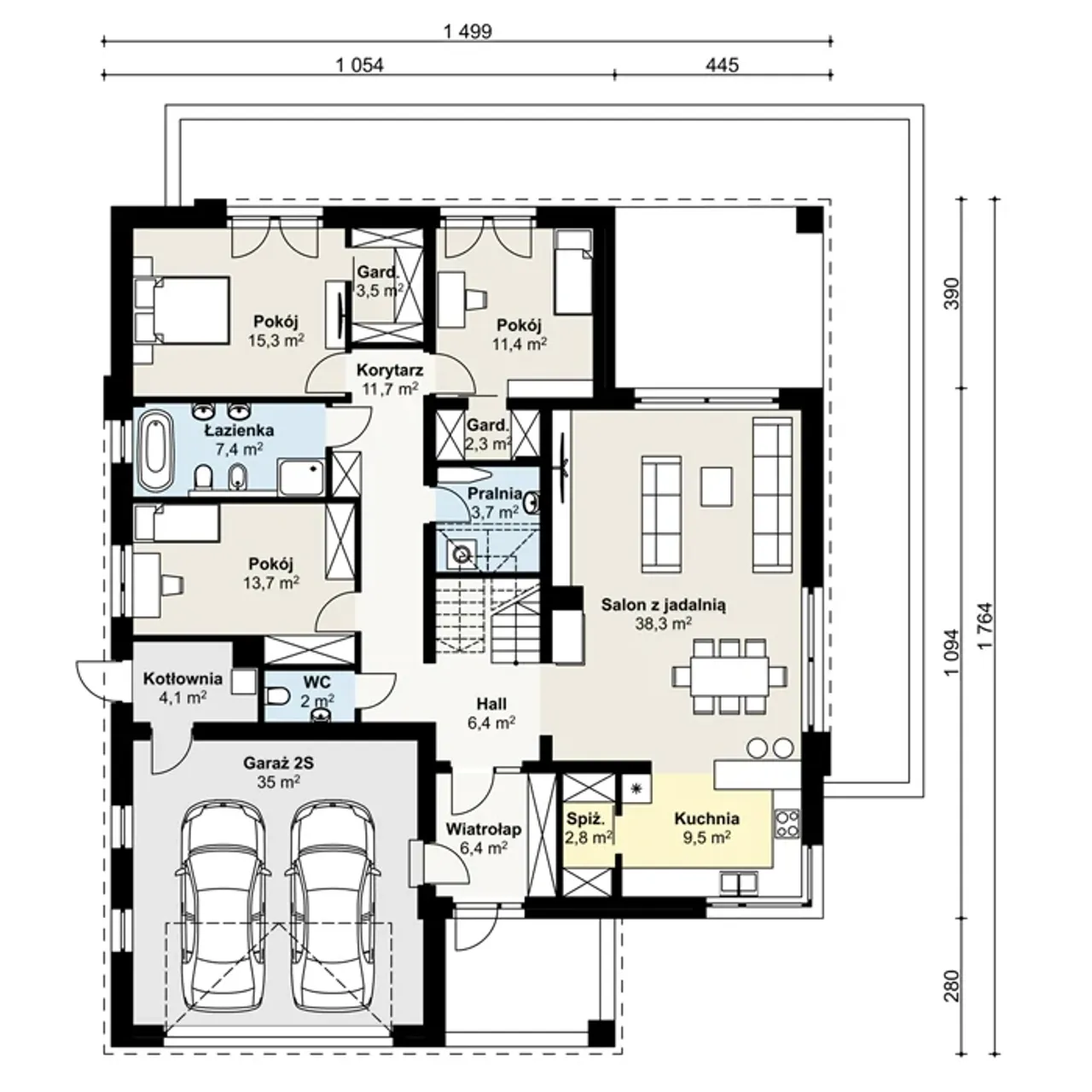 | 14. Salon z jadalnią | 38,30 m² |