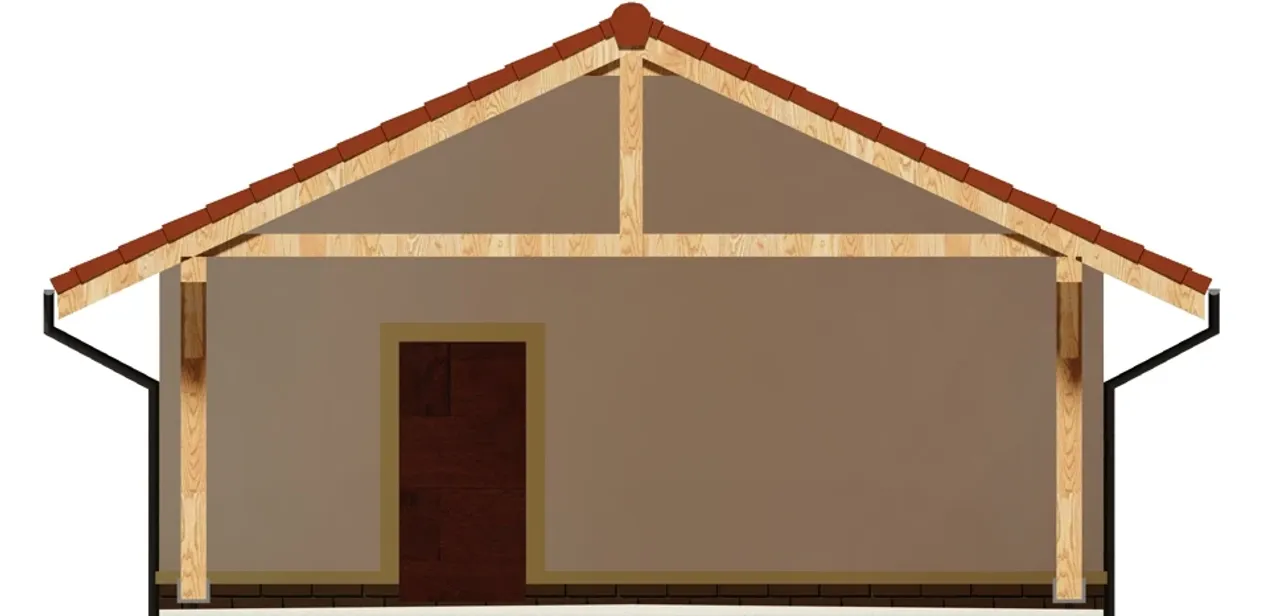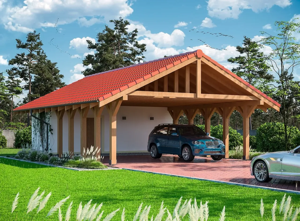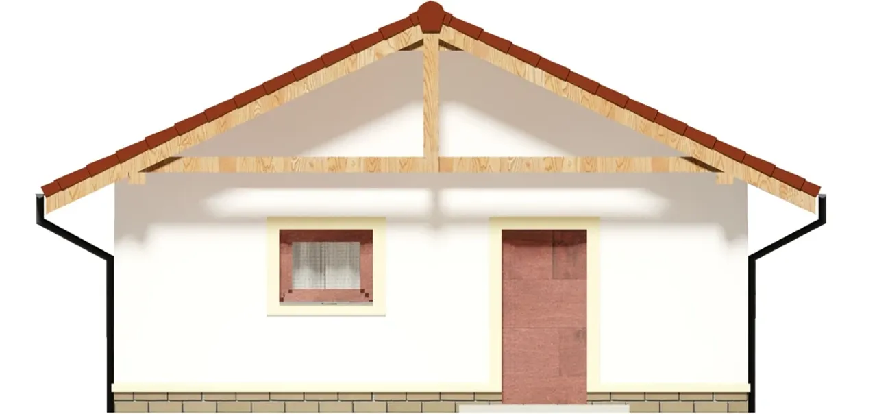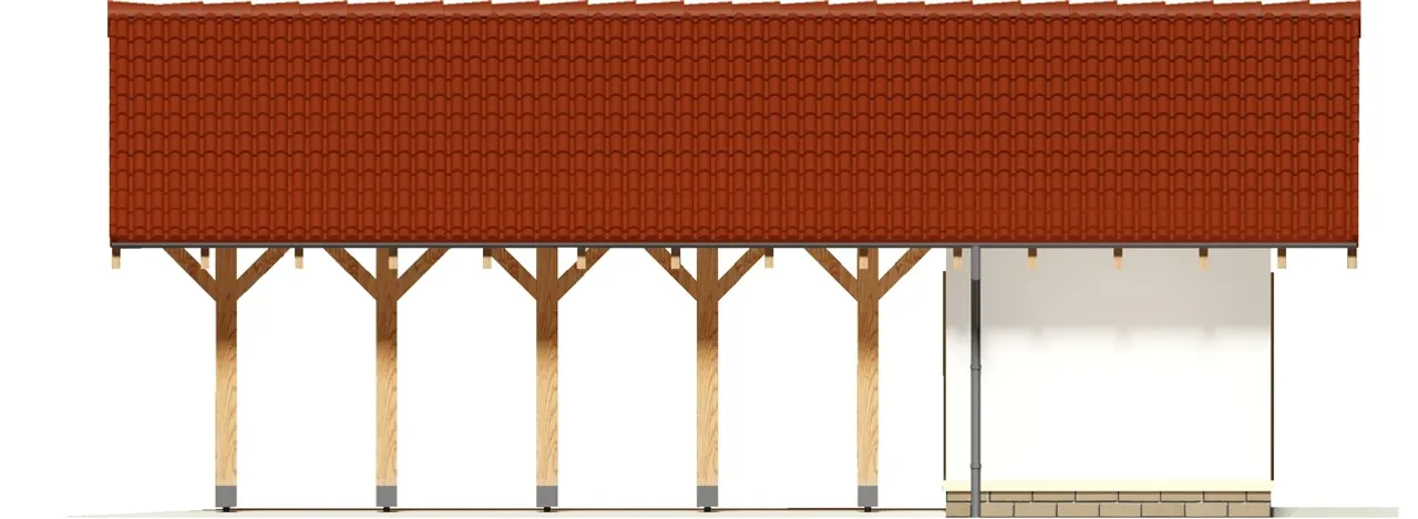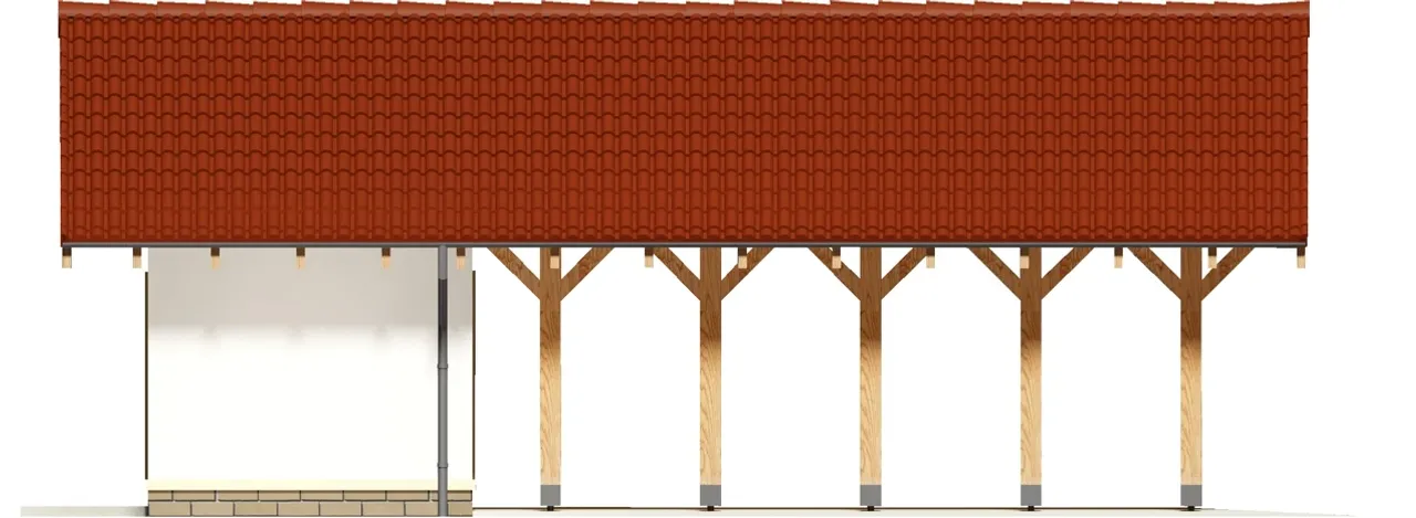 Konstrukcja wiaty wykonana z wysokogatunkowego drewna oraz dach dwuspadowy pokryty dachówką cementową lub ceramiczną gwarantują długowieczność i niskie koszty eksploatacji. Kalenica ustawiona prostopadle do drogi daje korzystną ekspozycję względem światła dziennego, natomiast ekonomiczny kąt nachylenia dachu (25°) sprawia, że projekt doskonale sprawdzi się zarówno na terenach miejskich, jak i podmiejskich. Budynek ten spełni oczekiwania rodzin szukających domu trwałego, nowoczesnego i funkcjonalnego.