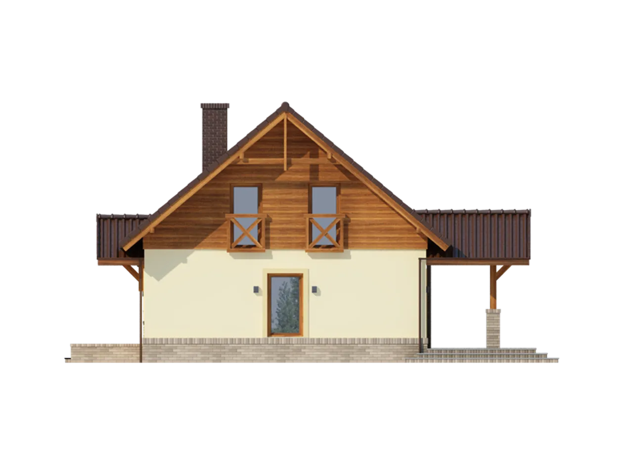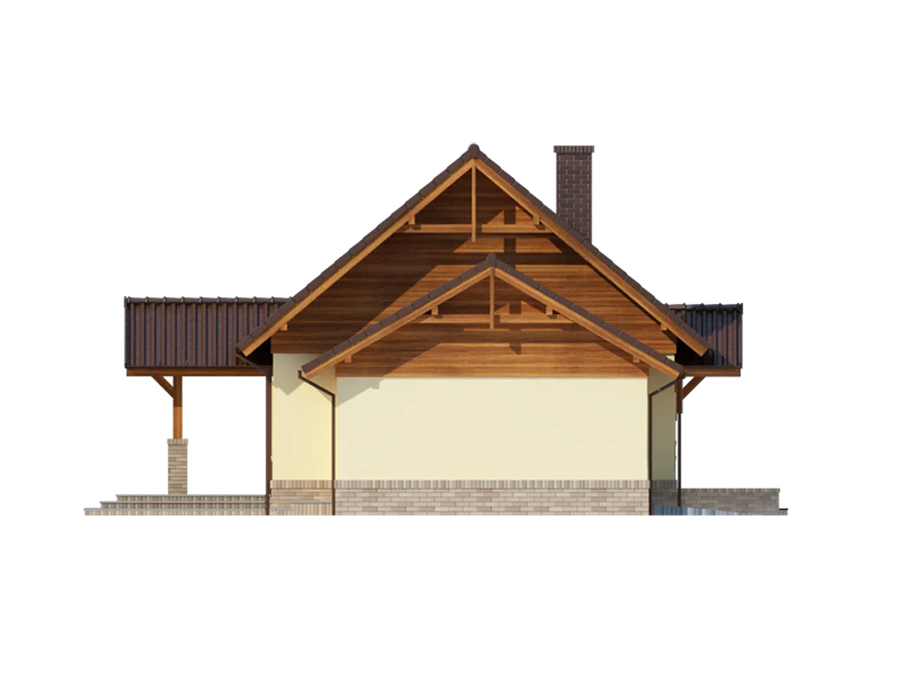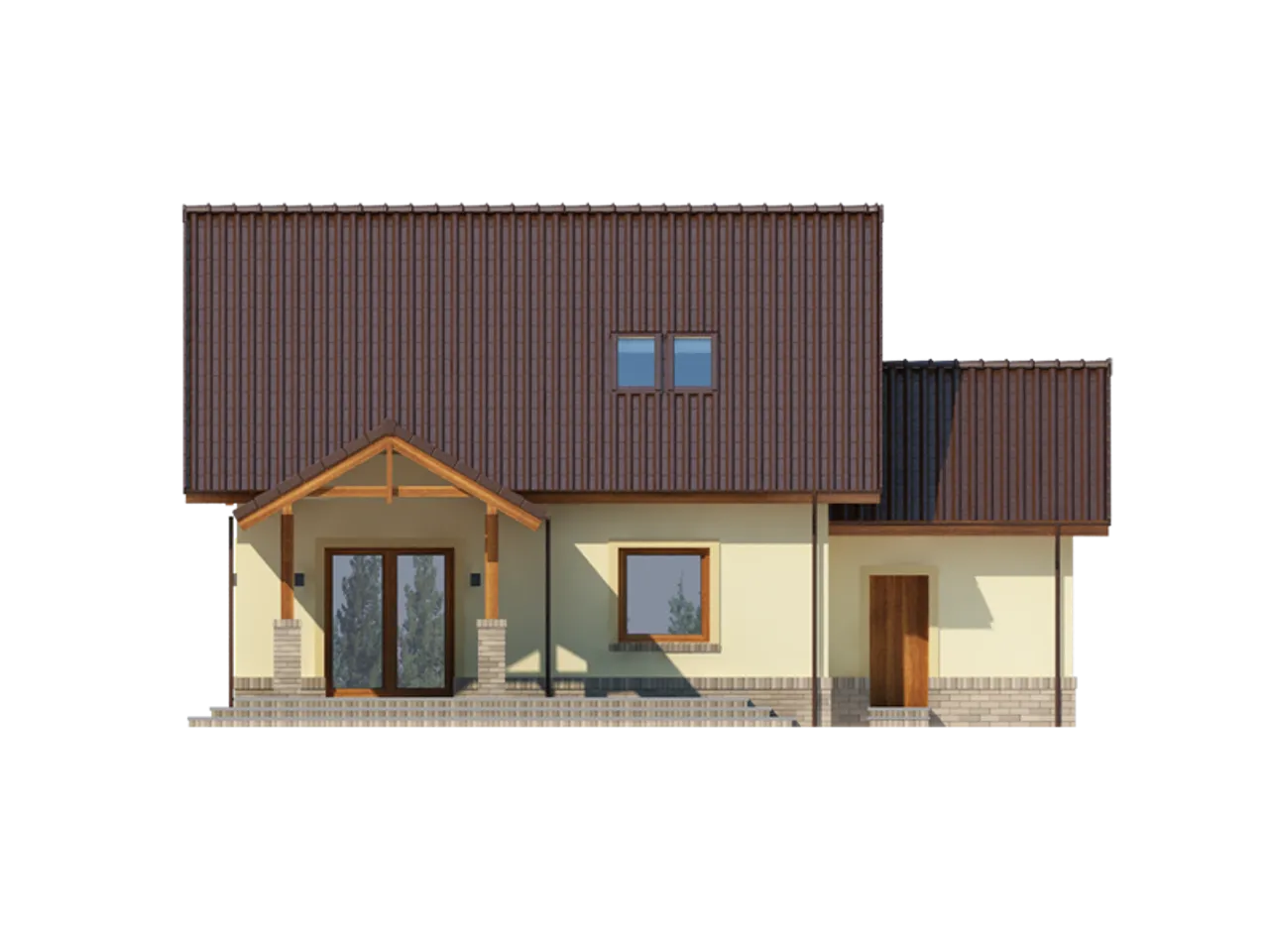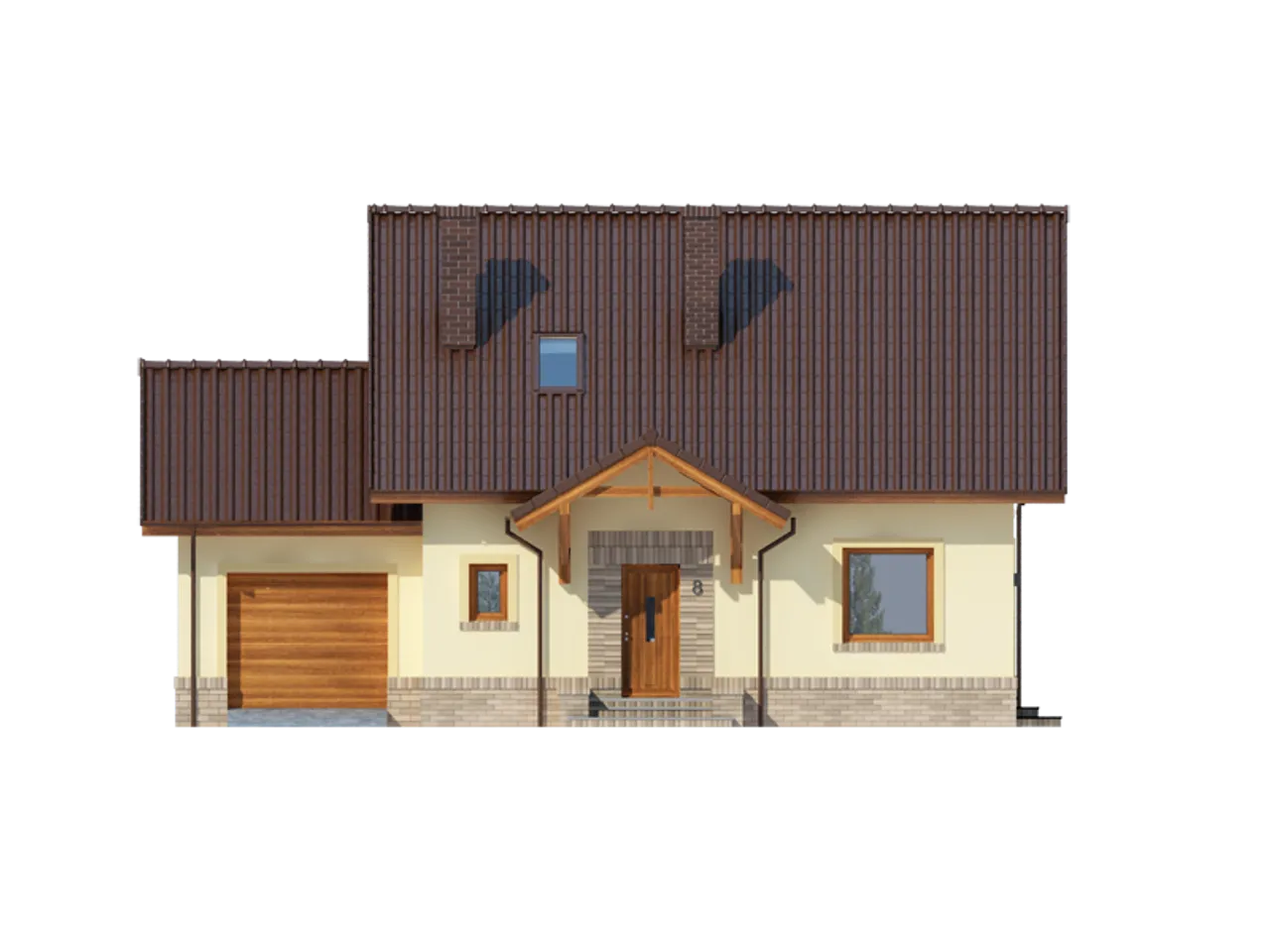 Projekt domu Aspazja to parterowy dom z poddaszem pokryty dachem dwuspadowym, budynek posiada klasyczny wygląd. Od strony frontowej znajdują się delikatnie zadaszone drzwi oraz wjazd do garażu jednostanowiskowego, z którego możemy dostać się bezpośrednio do wnętrza budynku. Projekt domu Aspazja od strony ogrodu przewiduje częściowo zadaszony taras. Dom spokojnie pomieści 4-5 osobową rodzinę.