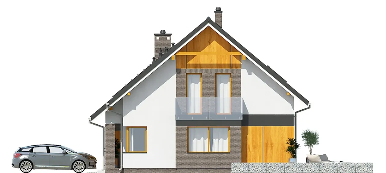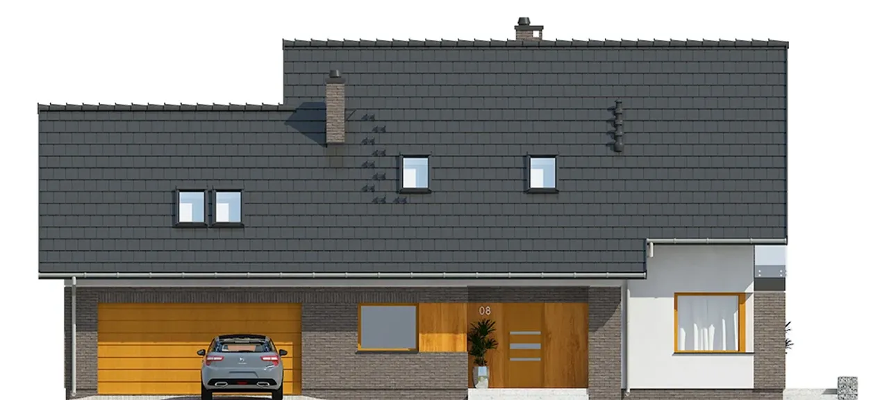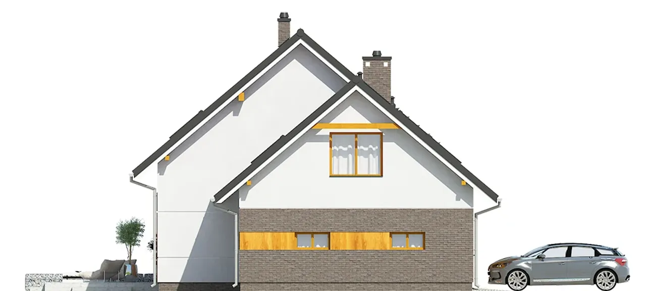 Garaż, przyklejony do bryły budynku, umożliwia bezpośredni dostęp do strefy mieszkalnej nawet podczas deszczu czy zimy. Technologia murowana oraz nowoczesne materiały gwarantują długą żywotność domu. Schody o solidnej betonowej konstrukcji (zarówno w piwnicy, jak i na poddaszu) są nie tylko trwałe, ale również bezpieczne i komfortowe w użytkowaniu.
