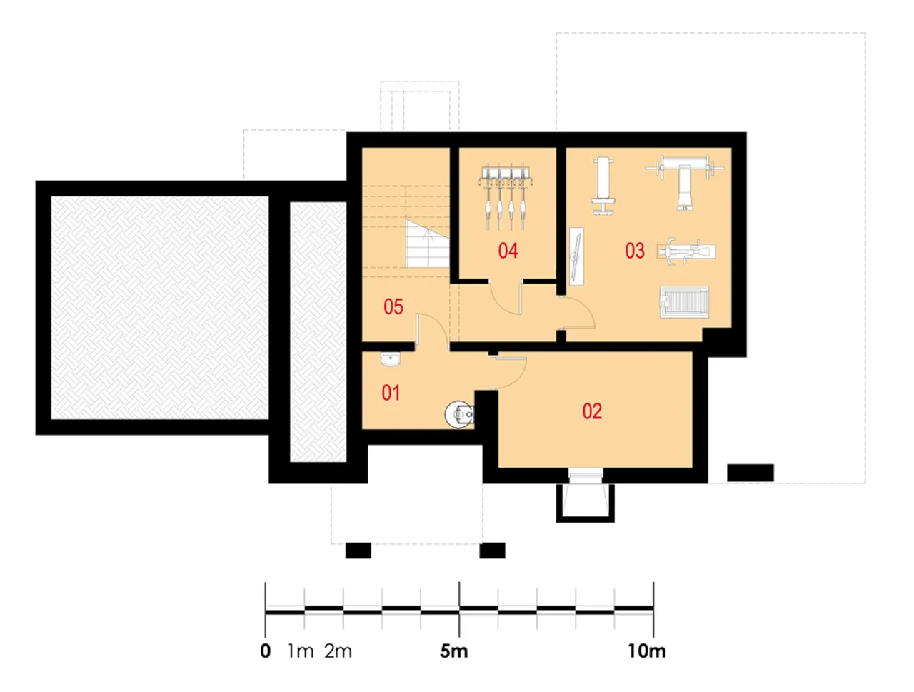 Ściany zewnętrzne z pustaka ceramicznego firmy LEIER o grubości 25 cm, ocieplone warstwą styropianu Termo Organika (20 cm), stawiają na trwałość i energooszczędność. Kominek obecny w projekcie sprzyja stworzeniu wyjątkowego klimatu w salonie. Żelbetowe stropy i schody gwarantują stabilność, niezależnie od natężenia życia domowego. Piwnica z dużą kotłownią otwiera możliwości - można ją wykorzystać jako zaplecze gospodarcze, miejsce na sprzęty czy dodatkową przestrzeń roboczą.
