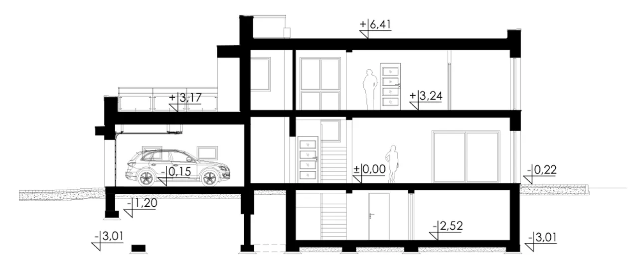 Nowoczesna stolarka: okna i drzwi PVC z roletami oraz segmentowa brama garażowa dbają o bezpieczeństwo i wysoki standard wykończenia. Stropodach niewentylowany nadaje bryle projektu domu Audax I PG2 wyrazisty, modernistyczny rys. Ogrzewanie można dopasować do indywidualnych preferencji - projekt przewiduje możliwość montażu kotła gazowego lub na paliwo stałe.