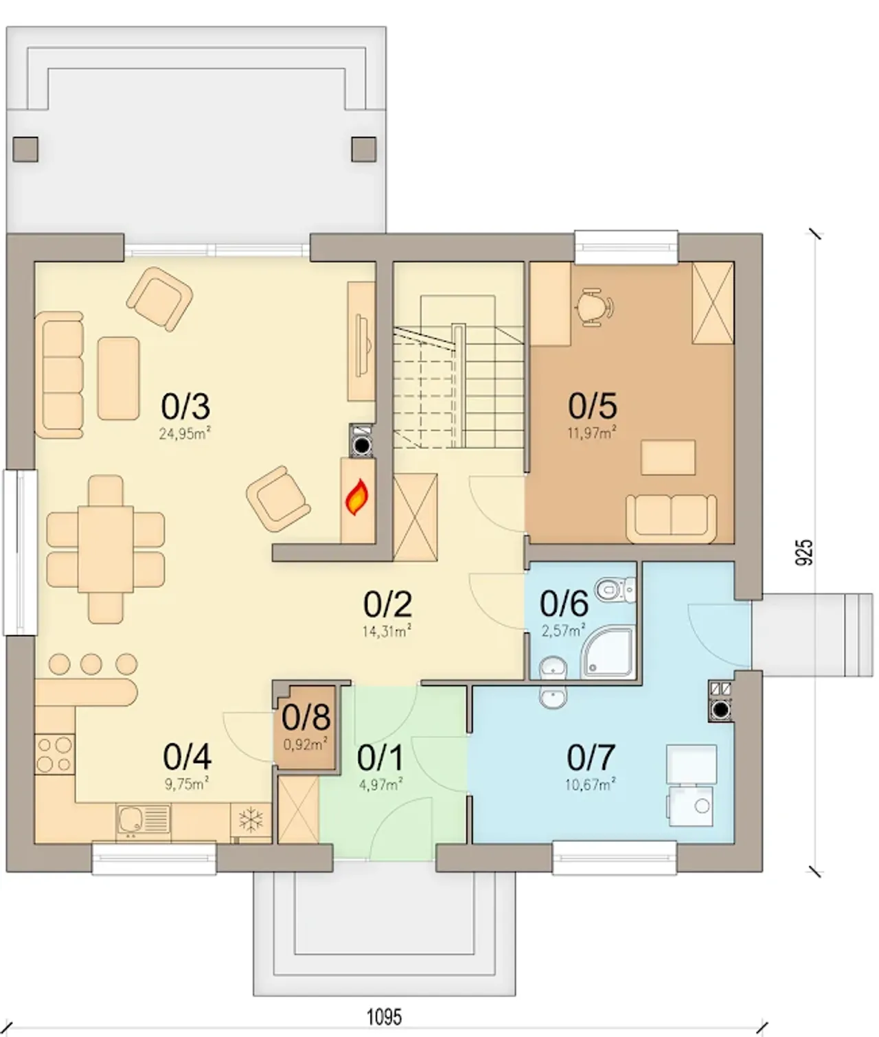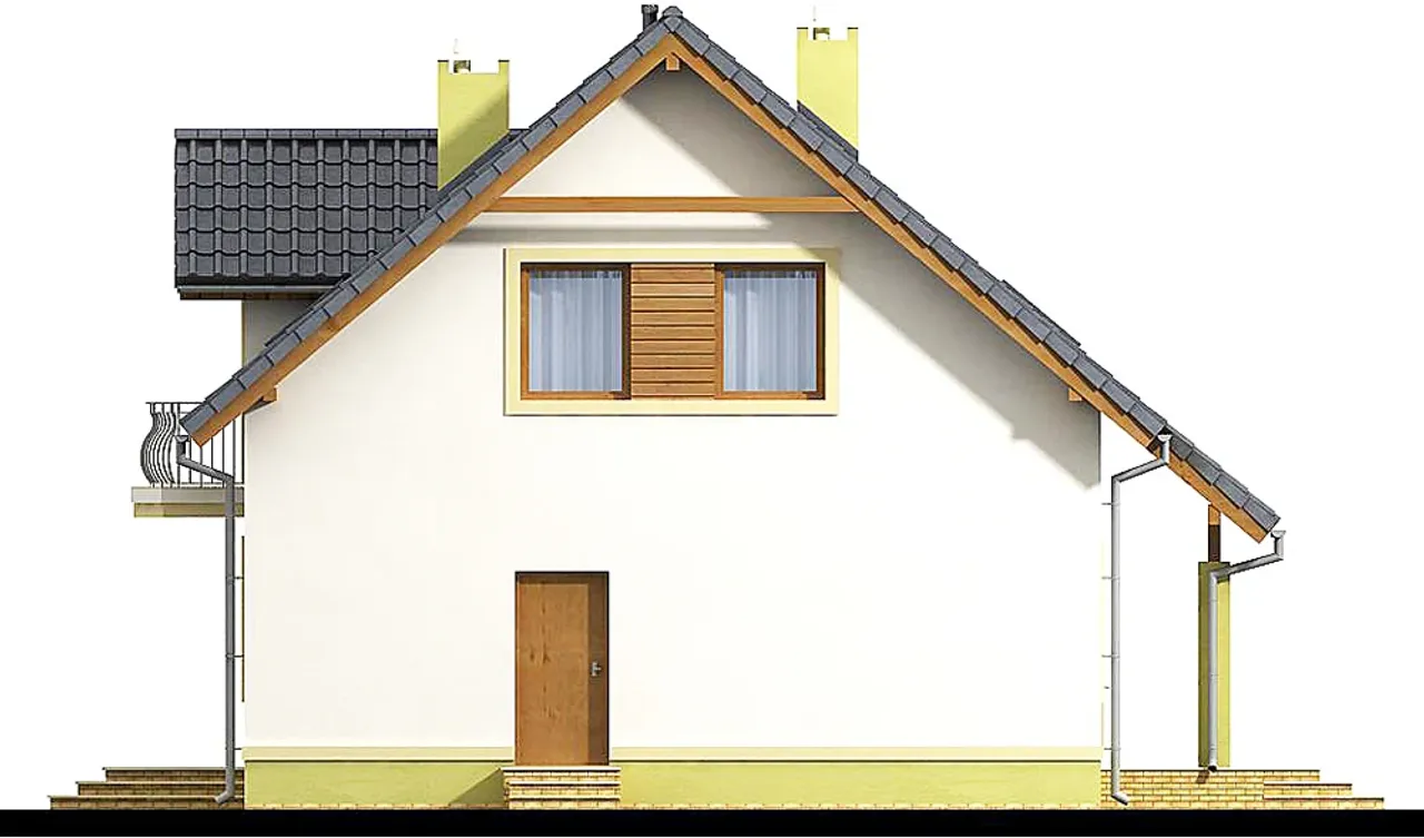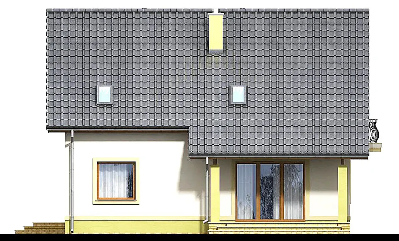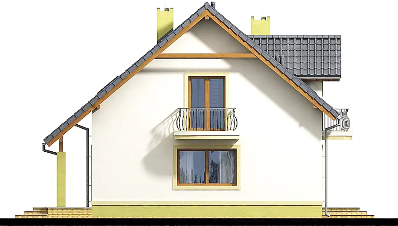 Pięć przestronnych pokoi, kominek w projekcie oraz komfortowy taras tworzą miejsce, gdzie można cieszyć się ciepłem ogniska domowego i relaksem na świeżym powietrzu. Brak garażu pozwala optymalnie wykorzystać metraż na potrzeby domu, a tradycyjna bryła świetnie wpisuje się w każde otoczenie.