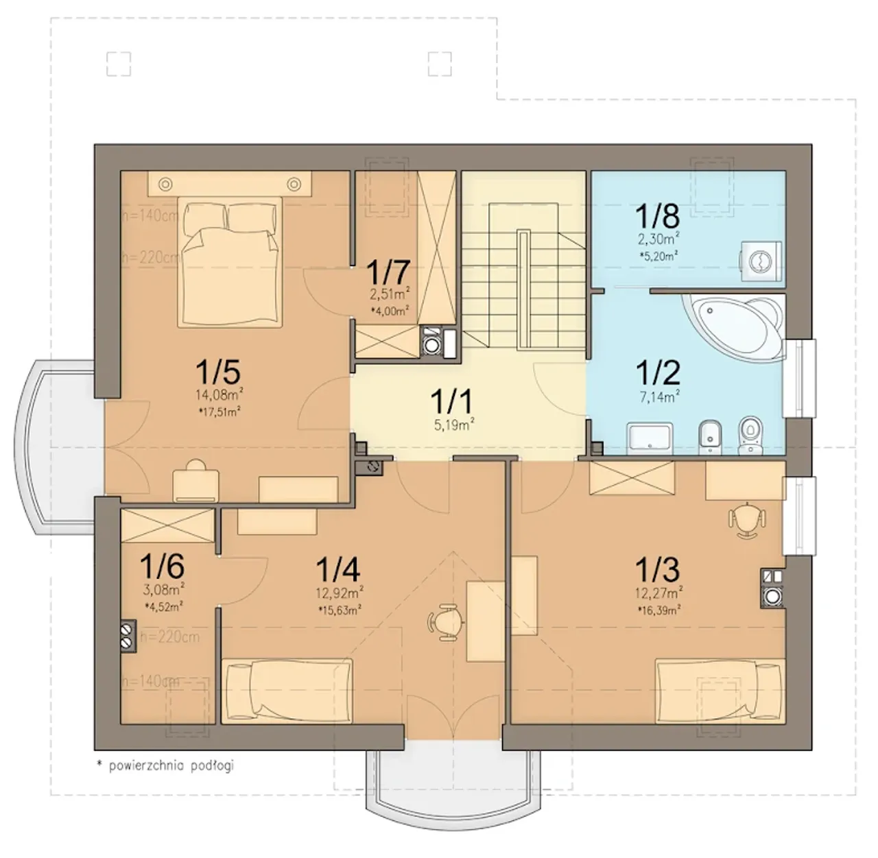 Strefa dzienna zachwyca przestronnym salonem z kominkiem, idealnym na długie zimowe wieczory. Bezpośrednie wyjście na taras zaprasza do relaksu na świeżym powietrzu i organizacji spotkań w gronie najbliższych. Brak podpiwniczenia ułatwia budowę na różnorodnych gruntach, a murowana technologia daje pewność, że dom zachowa swoje właściwości przez lata. Przemyślana konstrukcja stropu gęstożebrowego dodatkowo zwiększa akustykę i stabilność budynku.