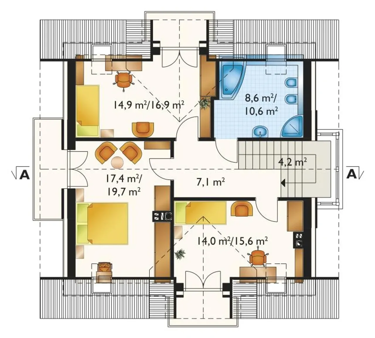 - rzut dachu - ukazuje jego kształt, wymiary, kąt nachylenia połaci, rozmieszczenie okien połaciowych, lukarn, świetlików i rur spustowych, pokazuje rozmieszczenie kominów i informuje o sposobie odwodnienia: rozmieszczeniu i rozmiarach rynien