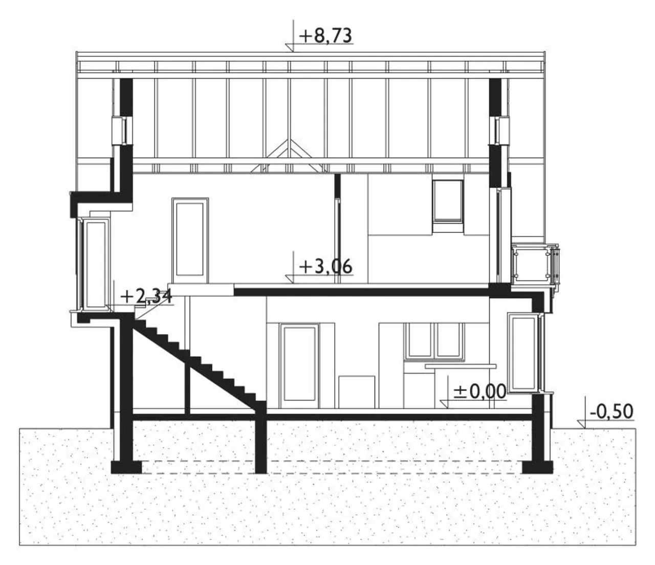 - przekroje - pokazują wszystkie elementy budynku po przecięciu go wzdłuż lub w poprzek od dachu do fundamentów tj. warstwy podłogi, stropów i dachu