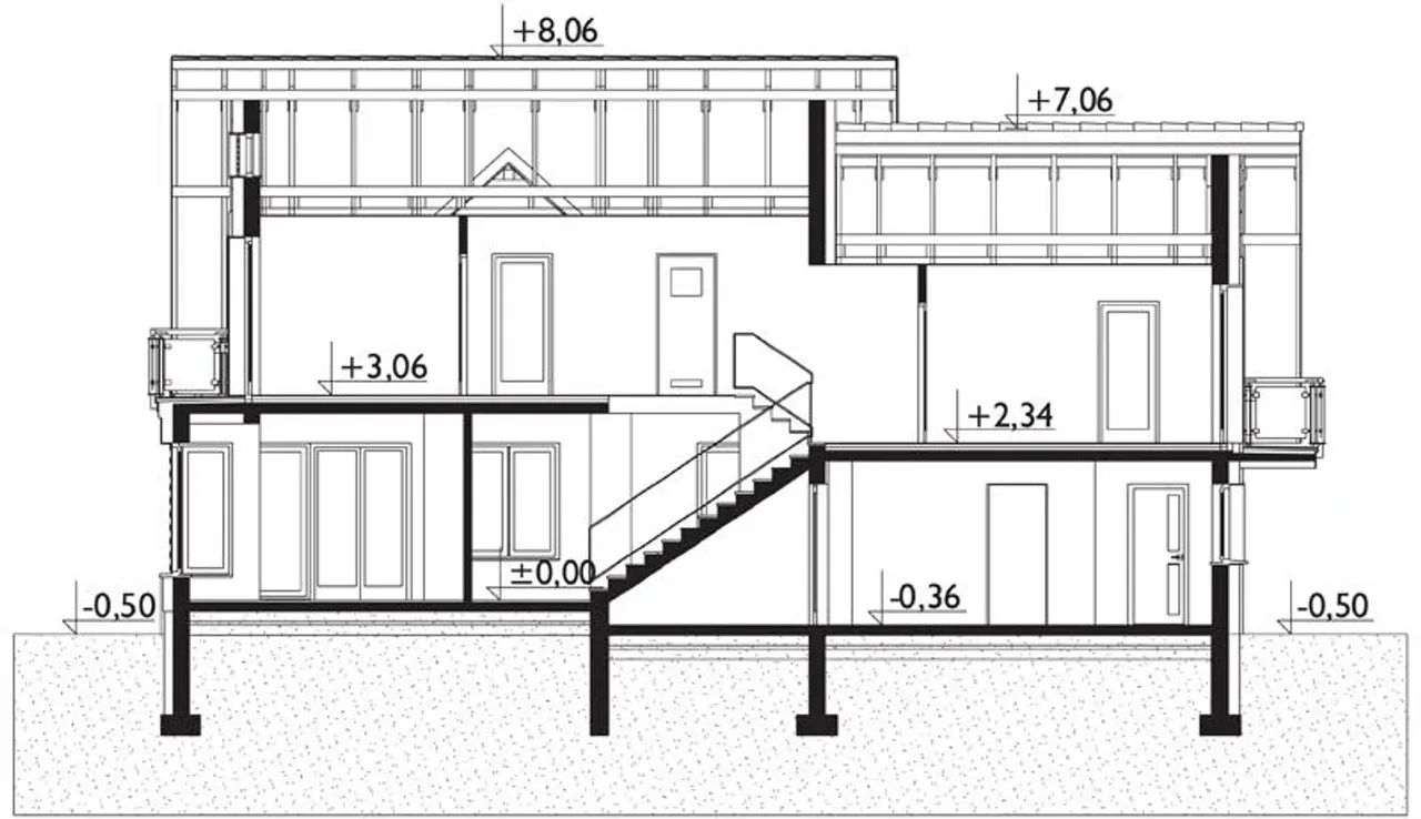 - przekroje - pokazują wszystkie elementy budynku po przecięciu go wzdłuż lub w poprzek od dachu do fundamentów tj. warstwy podłogi, stropów i dachu