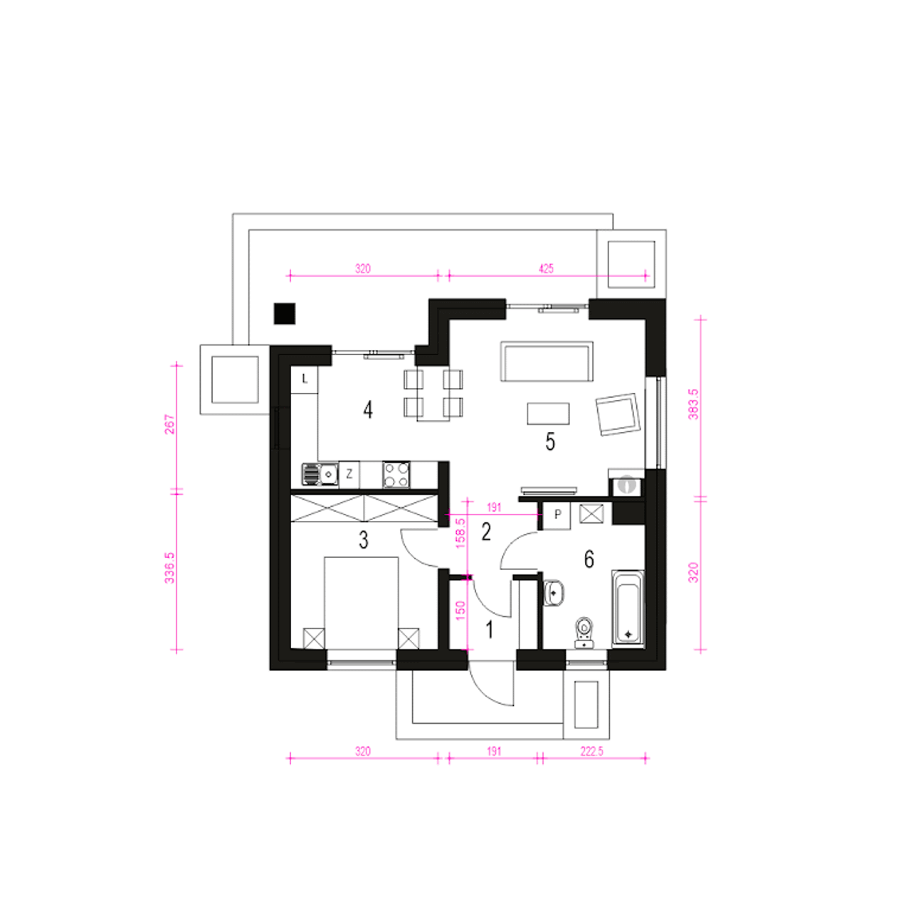 - Rozmieszczenie ścian działowych.