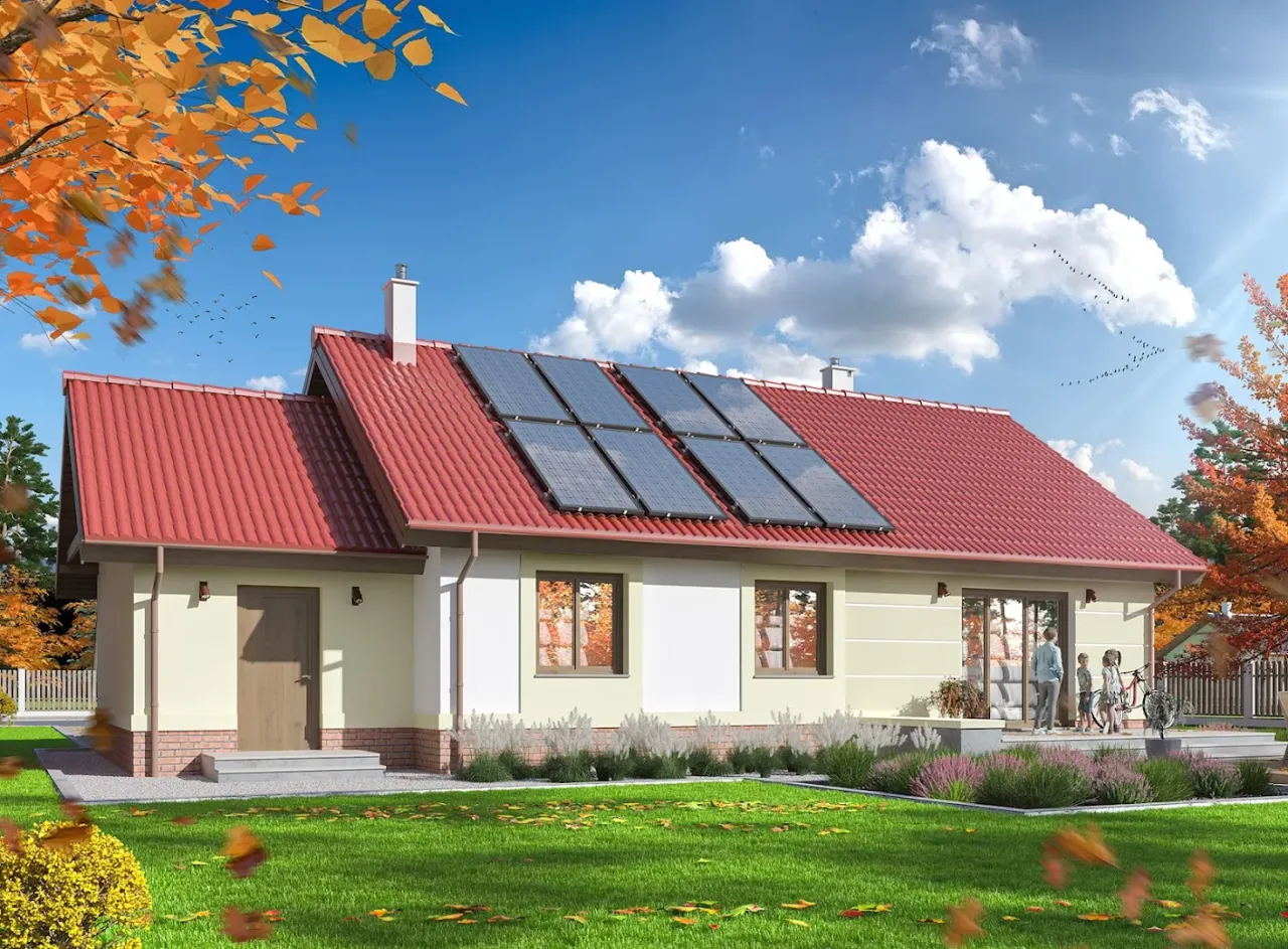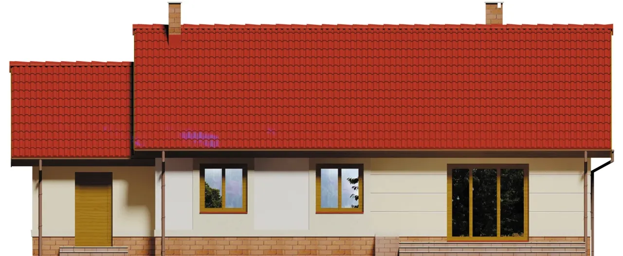 Projekt domu Bella II z garażem przedstawia dom parterowy z wbudowanym garażem jednostanowiskowym. Układ domu dzieli się na dwie części: dzienną i nocną. Część dzienną tworzą wiatrołap, przestronny salon, kuchnia z jadalnią oraz kotłownia. W części nocnej znajduja się trzy wygodne sypialnie oraz ogólnodostepna łazienka. Projekt domu Bella II z garażem jest wygodny i funkcjonalny.