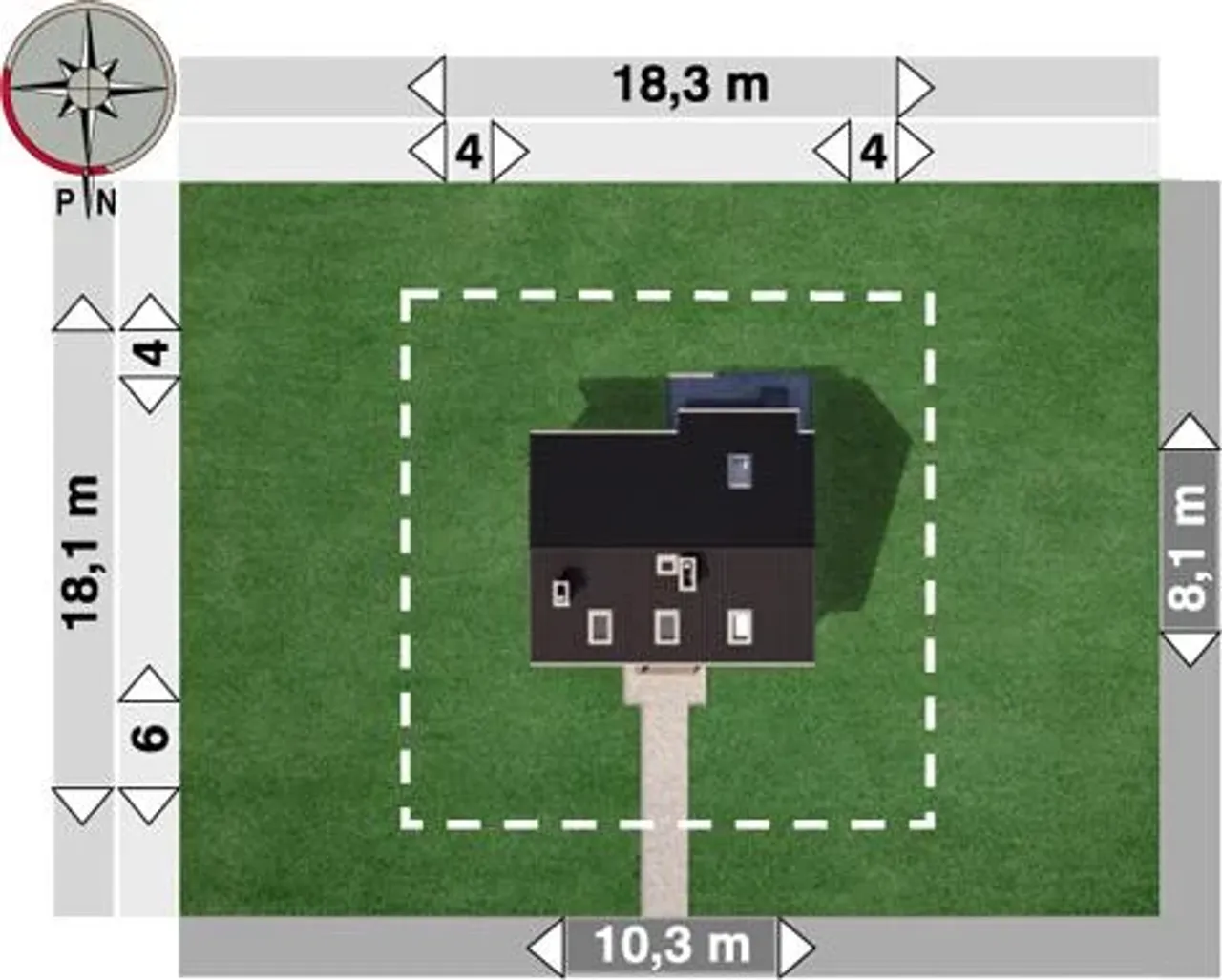 - rzut dachu - ukazuje jego kształt, wymiary, kąt nachylenia połaci, rozmieszczenie okien połaciowych, lukarn, świetlików i rur spustowych, pokazuje rozmieszczenie kominów i informuje o sposobie odwodnienia: rozmieszczeniu i rozmiarach rynien