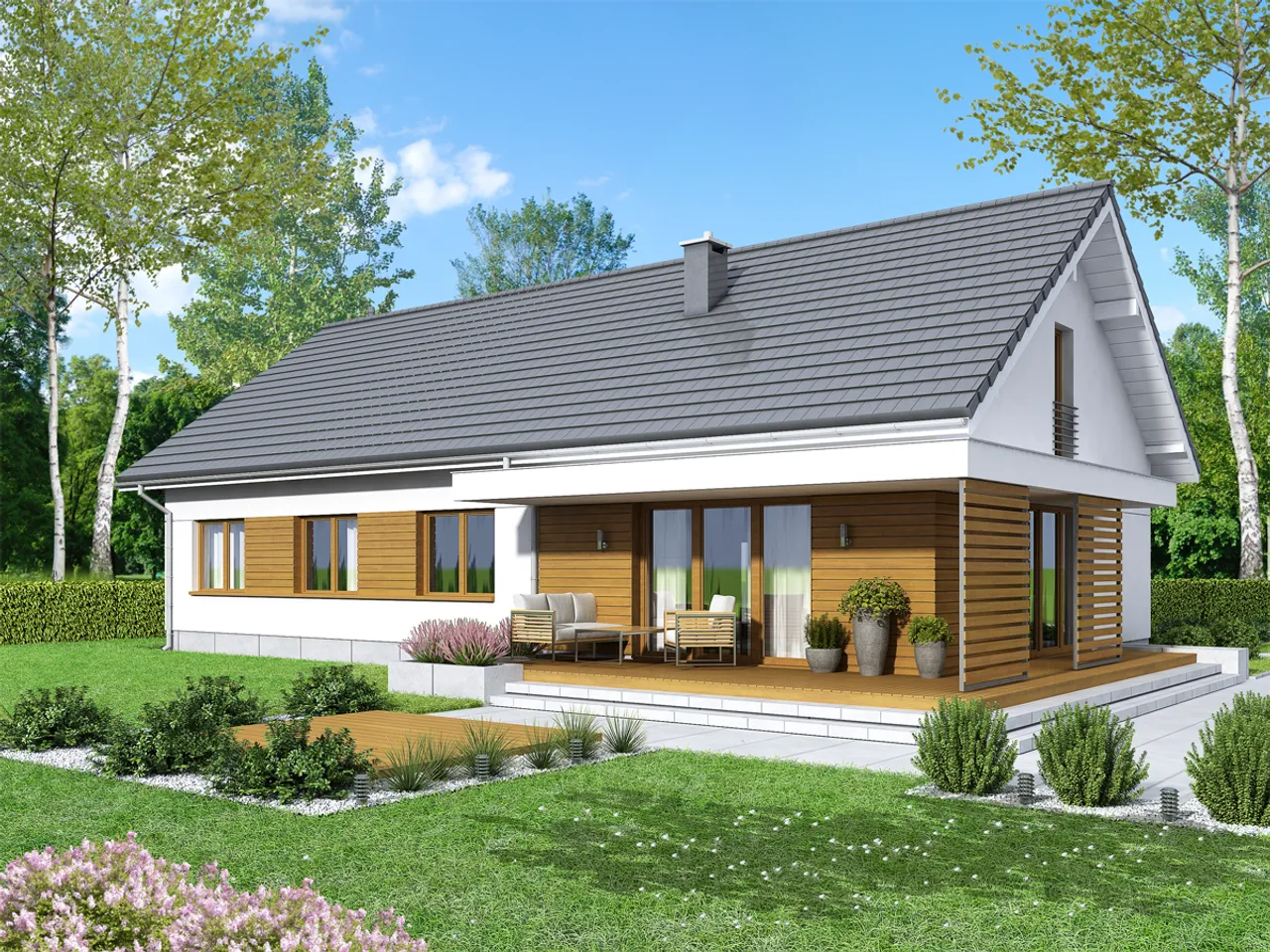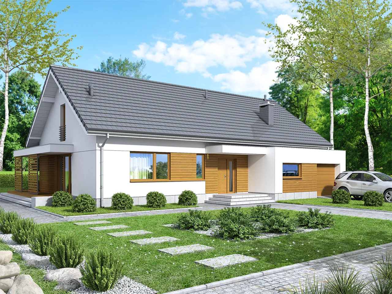 Bianco modern to dom parterowy bez podpiwniczenia, stworzony z myślą o wygodzie każdej rodziny. Przemyślany układ pozwala na komfortowe użytkowanie wszystkich przestrzeni - pokoje rozplanowano tak, by zapewnić domownikom swobodę oraz możliwość elastycznego urządzenia wnętrz. Zintegrowany z budynkiem garaż ułatwia komunikację i chroni samochód przed czynnikami zewnętrznymi.