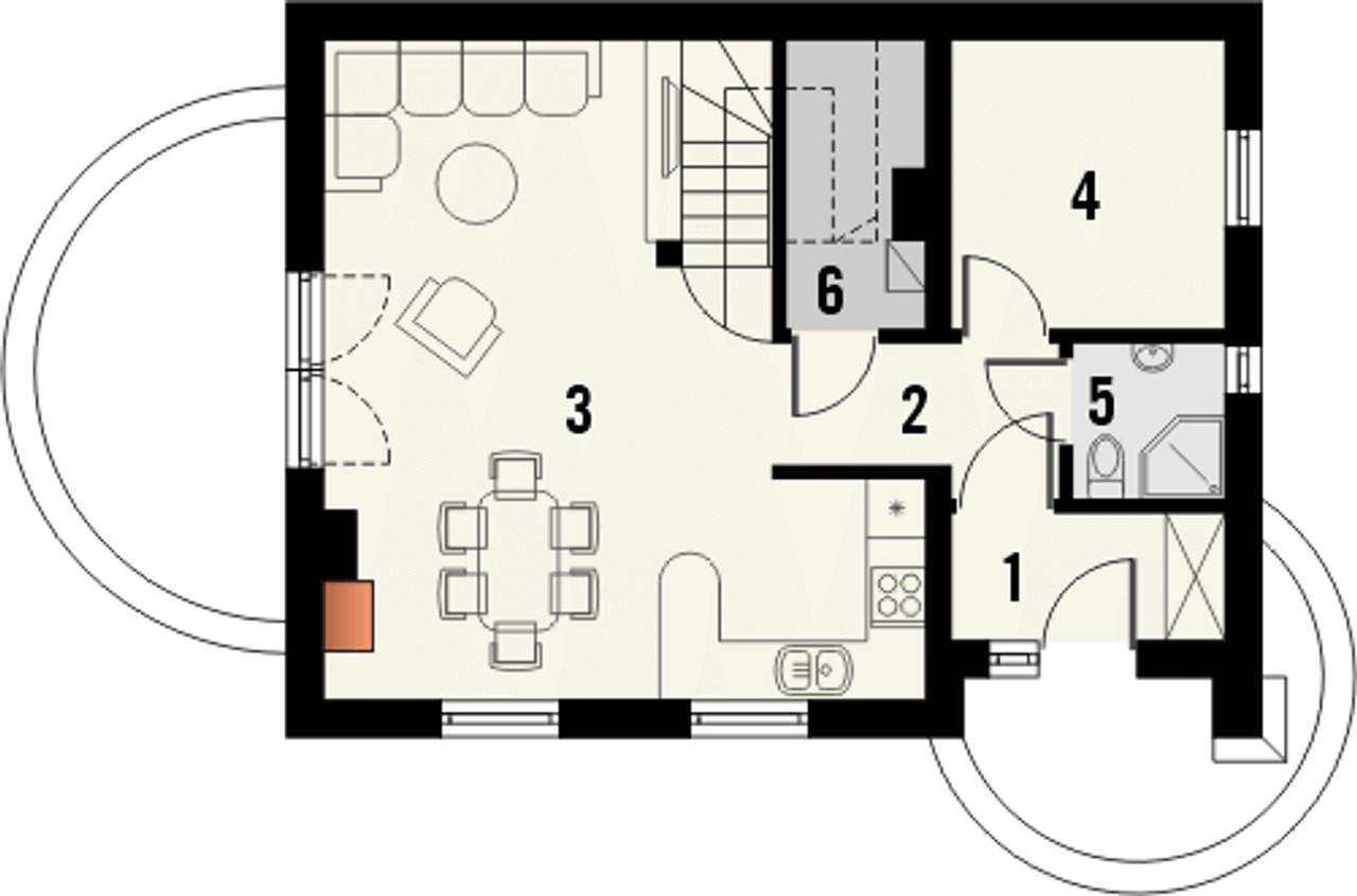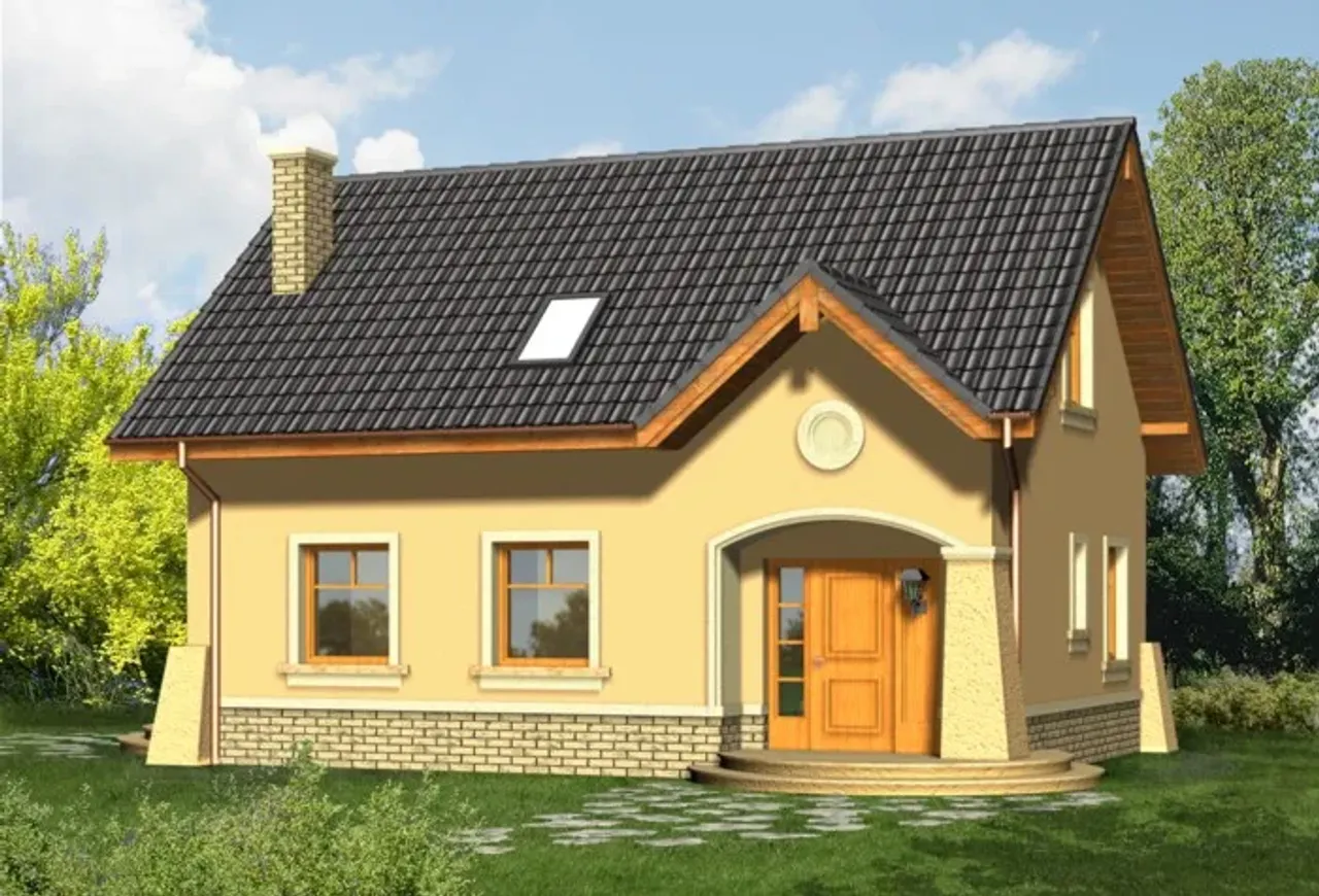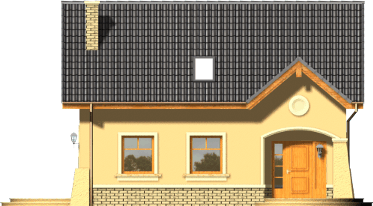 Elewacja frontowa przyciąga uwagę reprezentacyjnym narożnikowym wejściem, podkreślonym szczytem ozdobionym plafonem. Ściana szczytowa wyróżnia się dużymi oknami balkonowymi, które łączą salon z owalnym tarasem. Większa część przyziemia to przestronny pokój dzienny z otwartą kuchnią i jadalnią usytuowaną od frontowej strony.
